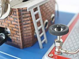 Wilesco D 16 steam engine with mirror polished and nickel plated boiler, diameter 2.25 in, length 5.5 in, boiler capacity 15 in, with water gauge glass. Boiler house with embossed brick type walls, 2 footbridges with ladder. Double action reversible brass cylinder with flywheel, spring loaded safety valve, additional steam whistle with chain, steam regulator, flywheel of 3.25 in diameter with grooved pulley, sturdy attractive die cast piston rods, centrifugal governor, steam jet oiler and railing. The condensed water is fed to a tank, hidden behind the boiler house, causing the chimney to smoke realistically. Finely painted metal base plate 9.75 in x 12.25 in. Height, including smokestack, 11.0 in, Weight: 3 lbs. 10oz. Unique Gifts for Men