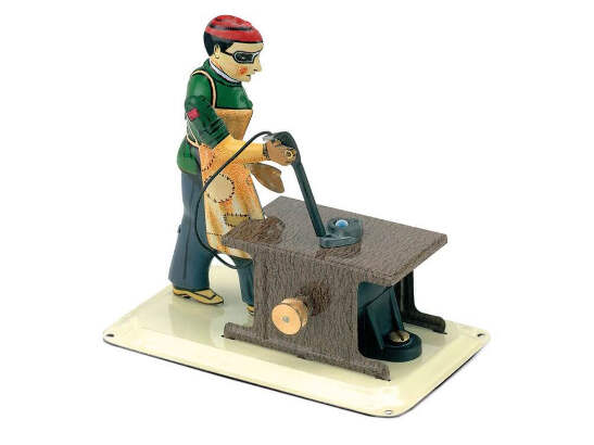 Wilesco's worker series is enlarged with an additional crafts man. The dynamo under the worktable generates enough energy to flash the LED under the welding rod. This symbolizes a lifelike arc.