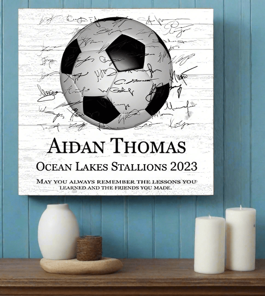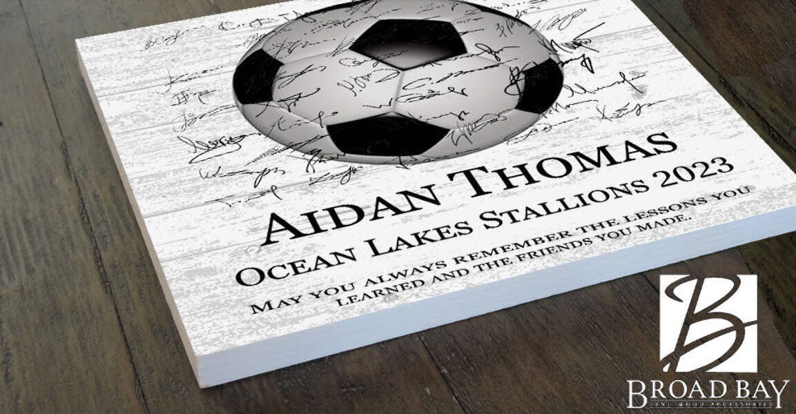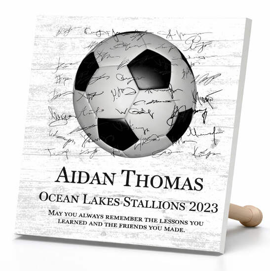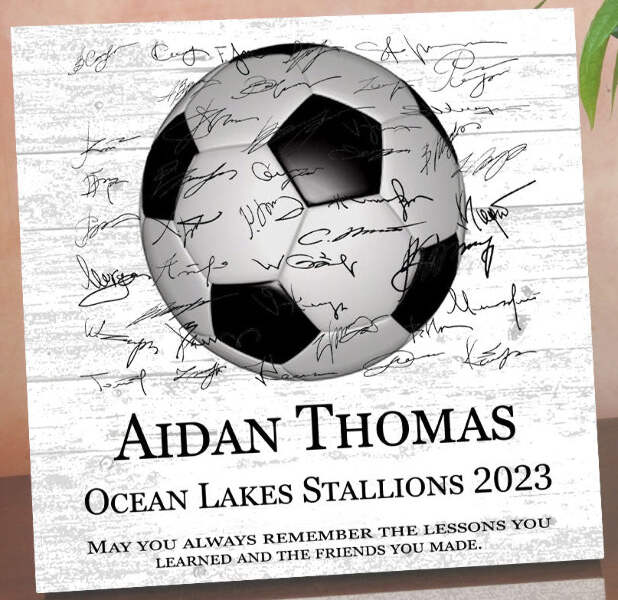 Celebrate a standout season, honor a senior player, or recognize a great coach with this personalized soccer award plaque. Handcrafted from solid American maple wood with space for the whole team to sign — a one-of-a-kind keepsake they'll treasure forever.