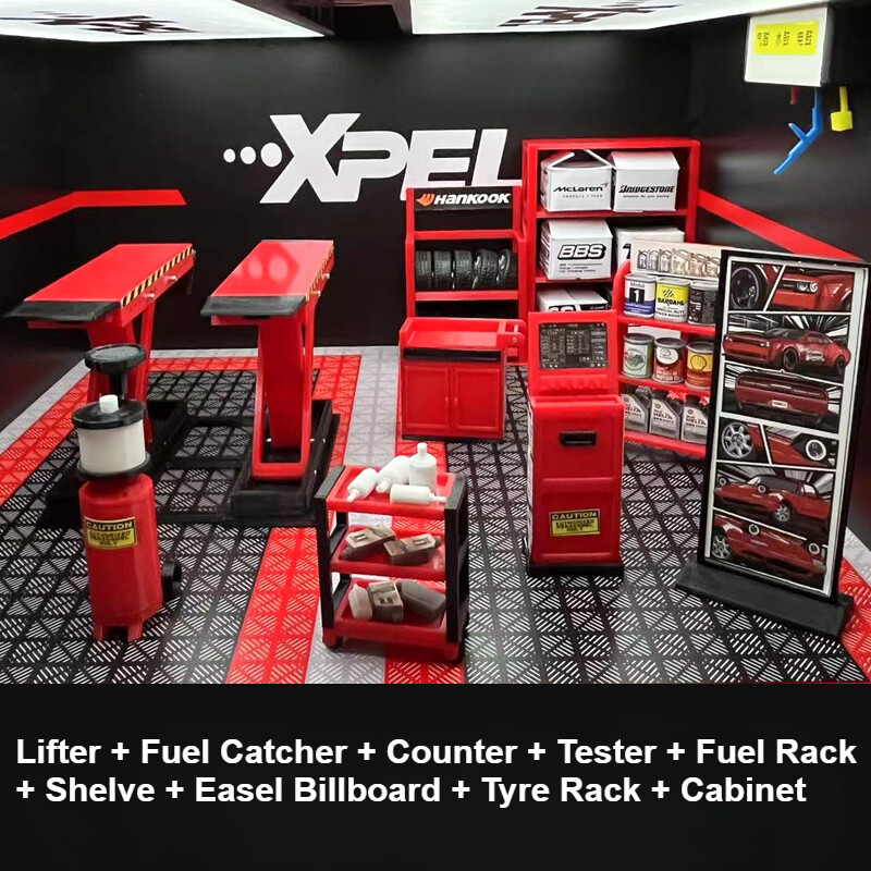 The red set only has Lifter, oil catcher, counter, tester, oil rack, shelves, easy-open billboards, tire racks, cabinets total nine sets