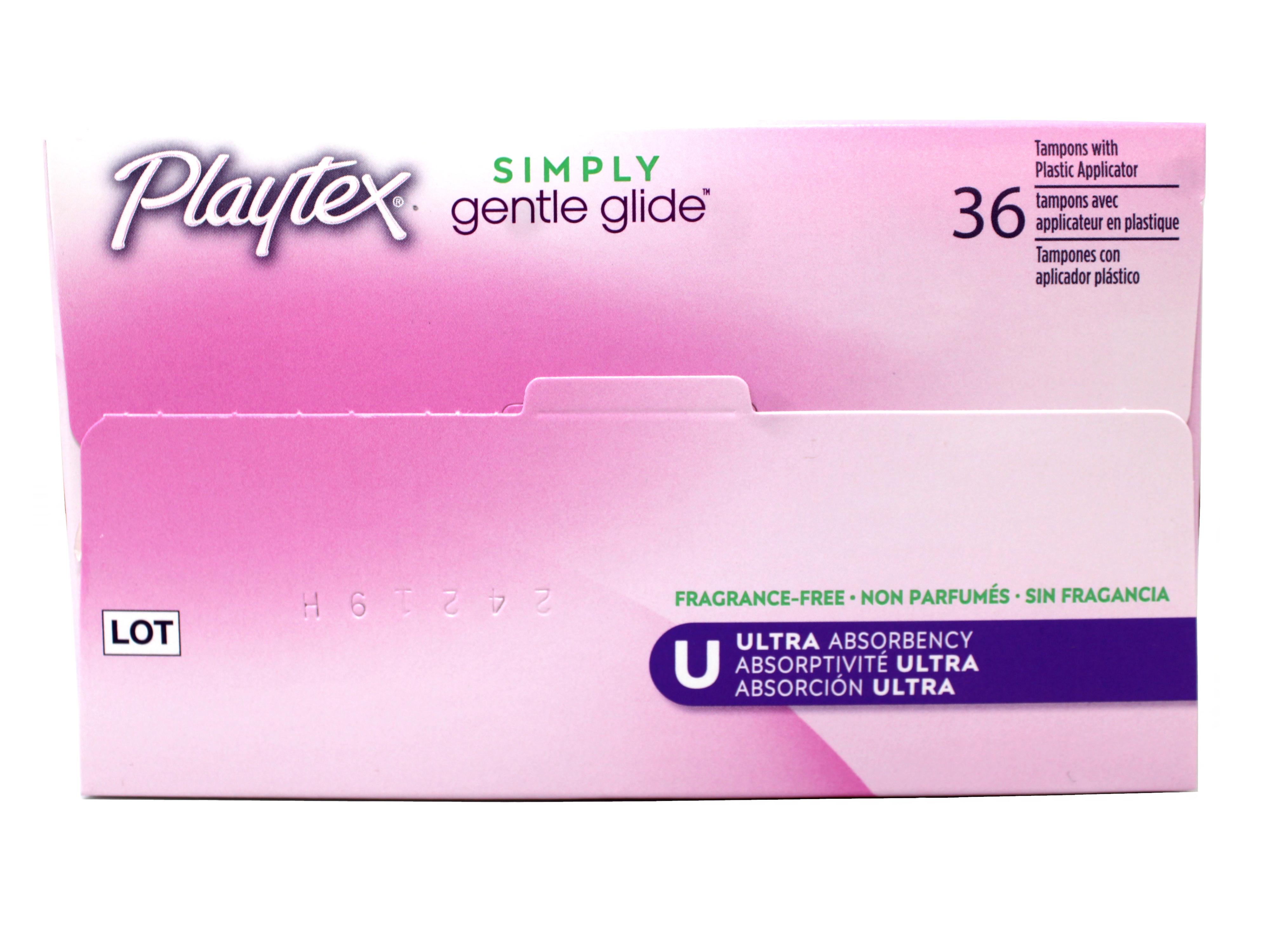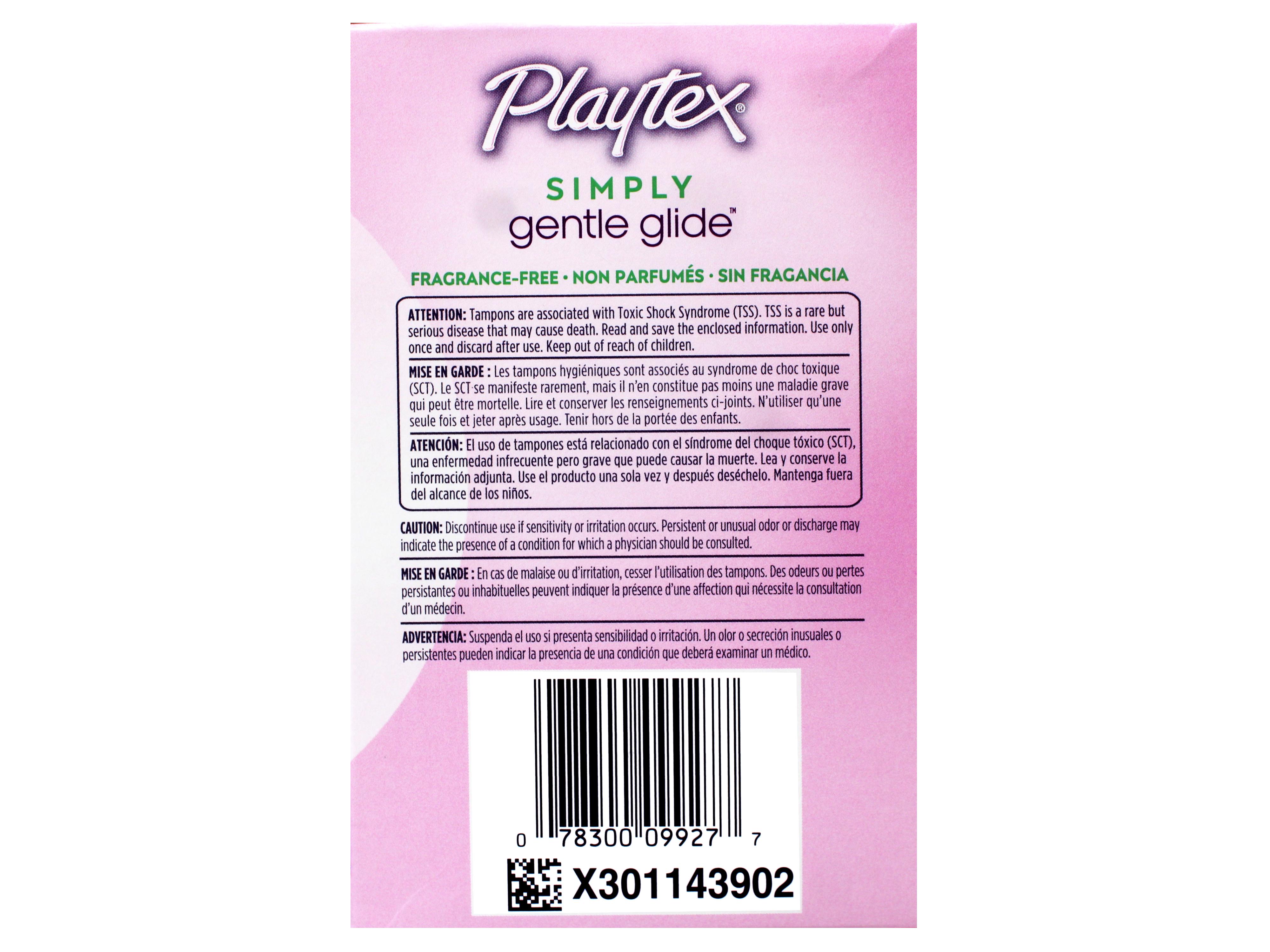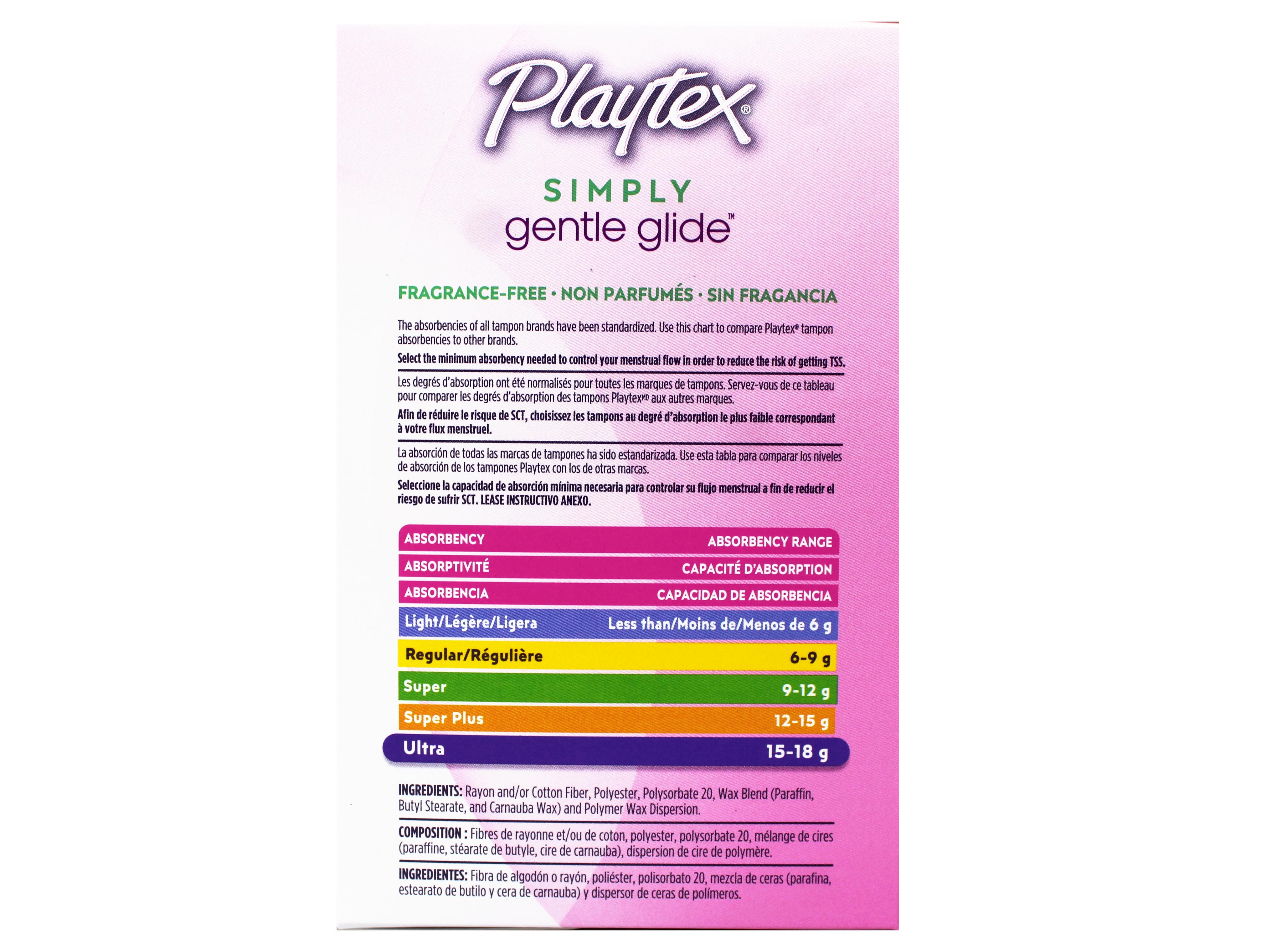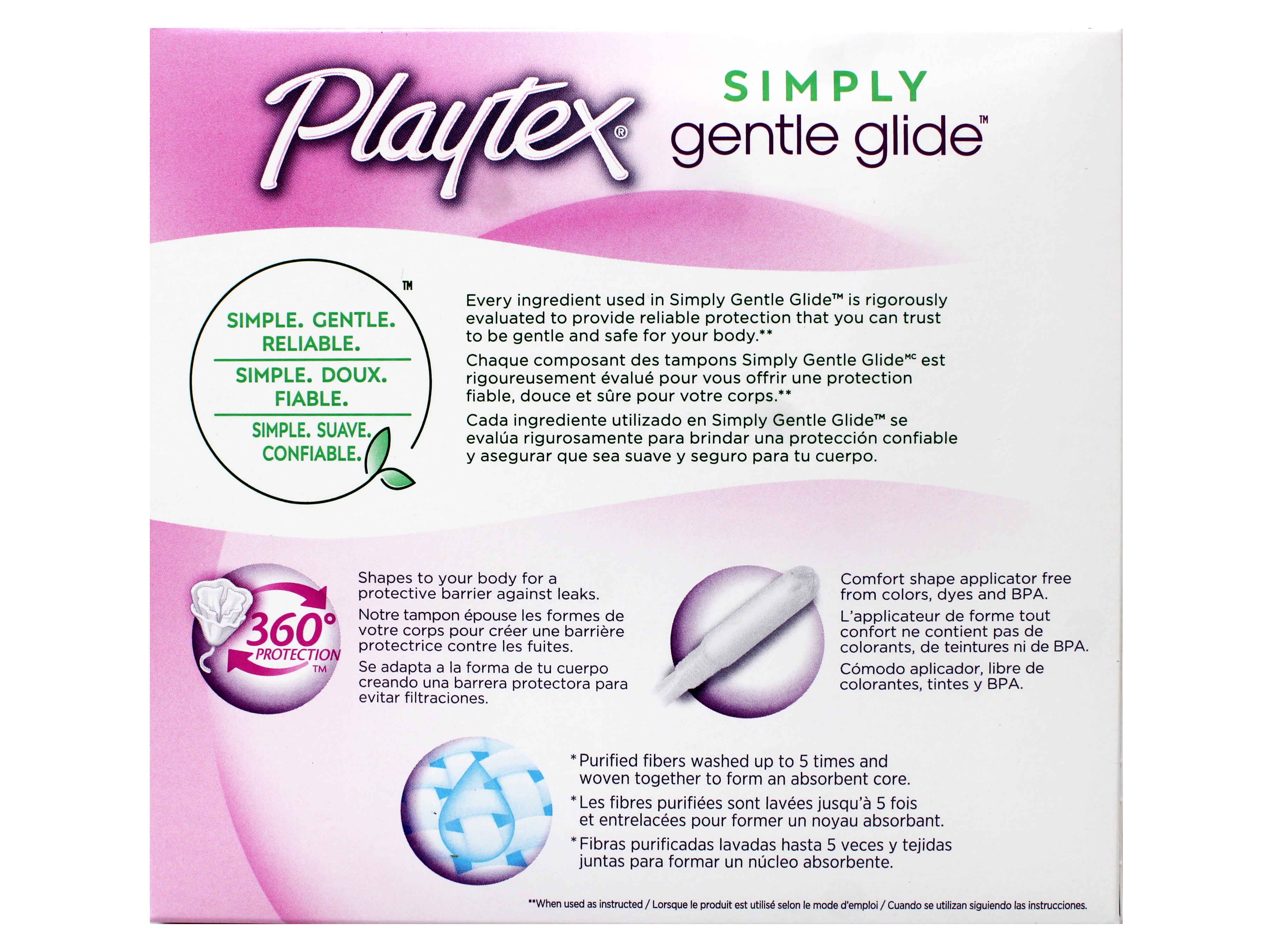 Simple. Gentle. Reliable. Every ingredient used in Playtex® Simply Gentle Glide™ Tampons Unscented Ultra Absorbency is rigorously evaluated to provide reliable protection that you can trust to be gentle and safe for your body.* With purified fibers washed up to five times** and a comfort shape applicator that's free from colors, dyes and BPA, you can feel good about choosing Simply Gentle Glide™! *When used as instructed. **Purified fibers washed up to 5 times and weaved together to form an absorbent core 360° Protection - shapes to your body for a protective barrier against leaks Purified fibers - washed up to 5 times and weaved together to form an absorbent core Comfort Shape Plastic Applicator - comfort shape applicator free from colors, dyes and BPA