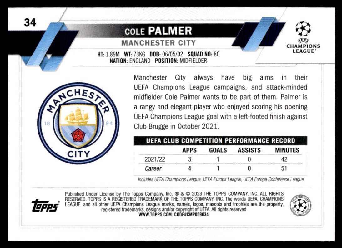 2022 Topps UEFA Club Competitions Cole Palmer Manchester City #34