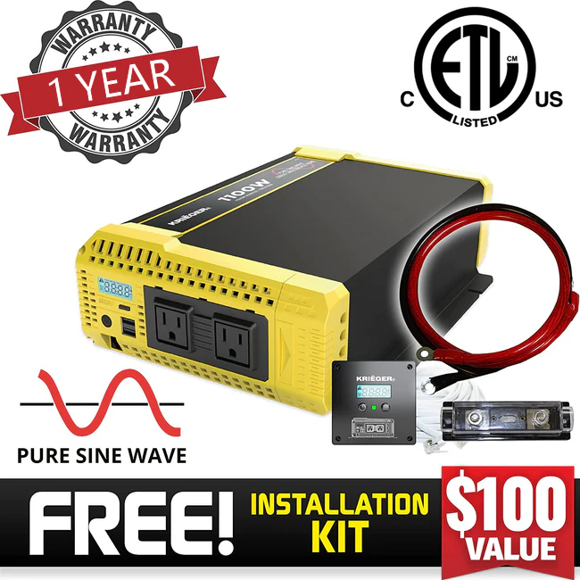 The Krieger KP1500, 1500 watt inverter powers small appliances, power tools and more. Unmatched performance, our inverters are designed and built to handle inductive loads; watt per watt we outperform our competitors. Product Specification: 1500 watt of continuous capacity and 3000W Peak. This product has been tested, validated and approved by ETL under UL STD 458 for both its safety and performance. Input Voltage: 12V DC, Output voltage: 110V~120V. Dual USB with QC 3.0A each. LCD Display: Input Voltage / Output Wattage / Battery Level. This inverter has all the protections that you will need, Overload, Temperature, short circuit and all of these protections are displayed on the front LCD. Our version of an all-inclusive 1 x 1500W Power Inverter 1 x set of 3 FT 4 gauge cables!