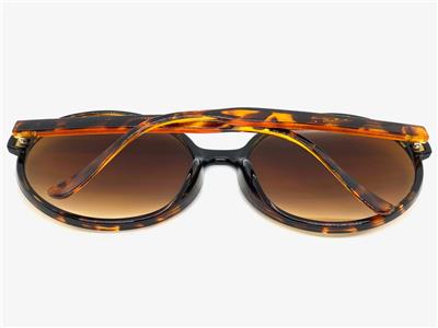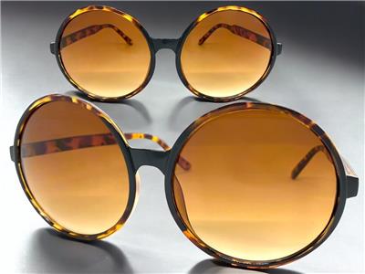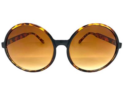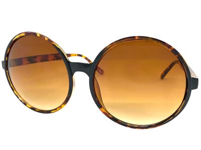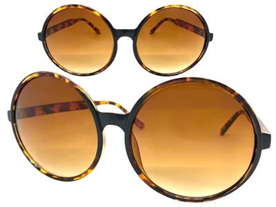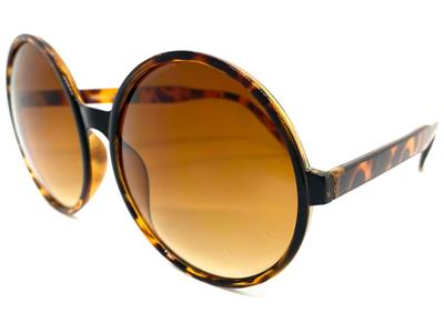 with an X-large round tortoise shell frame. The lenses are tinted brown