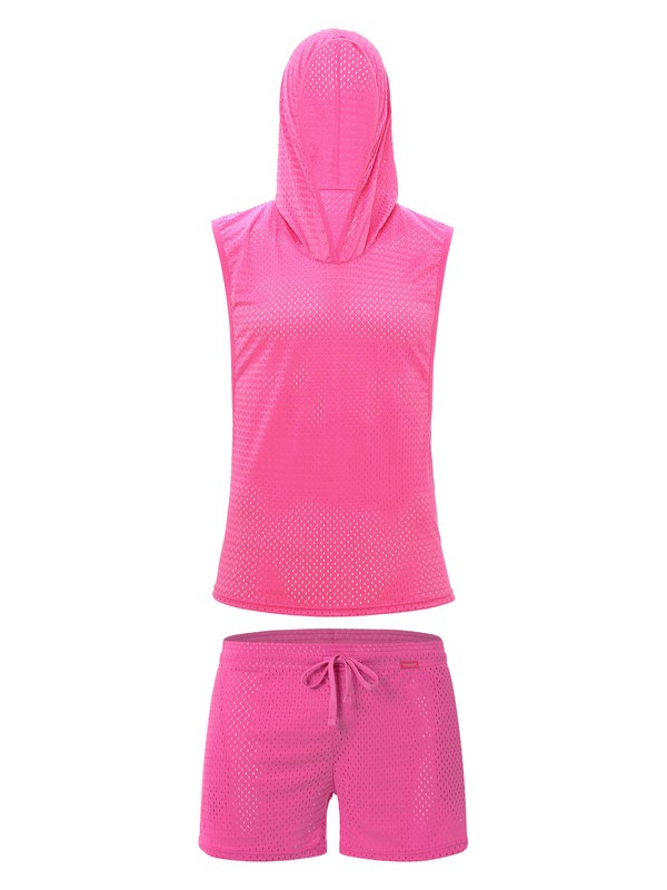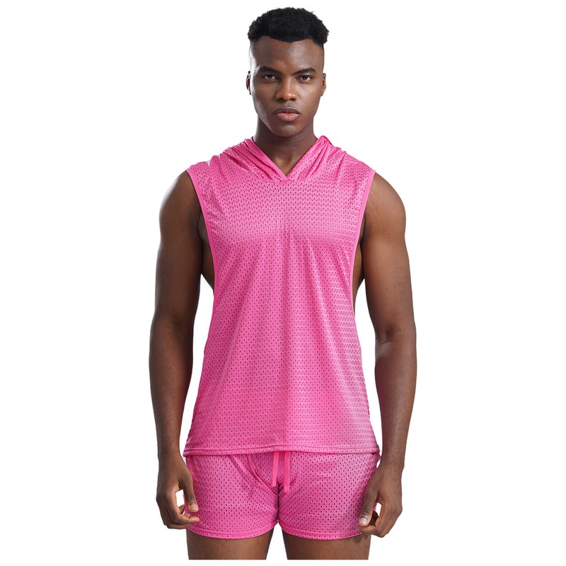 Hooded, sleeveless, racer back workout vest. Middle waist, elastic waist with drawstring ensure adjustable and secure fit.