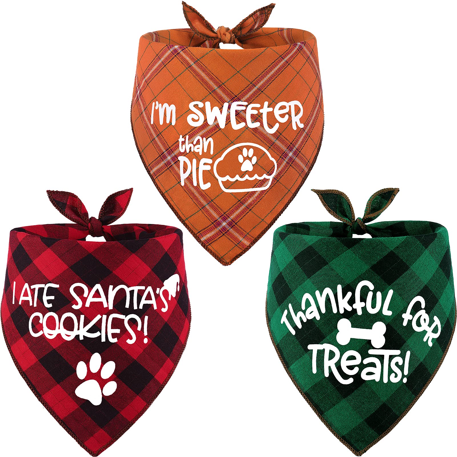 Holiday dog bandana make your pet looks stylish and lovely in every occasions! Unique Design & Features - With the 3 pcs of different of halloween, thanksgiving, Christmas prints pet kerchiefs, you will get 6 styles for your pets actually. - Back side classic lattice plaid make the item classic and brings more fun in daily! - High quality material made the bandanas super absorbent, breathable and comfortable. - Size: Base 26” x hypotenuse 17”, Suitable for dog's neck size up to 21”. Please measure the size of your pets and leave room to tie knot. - Printing pattern: "i 'm sweeter that pie", "thankful for treats", "i ate santa cookies". Pefect Gift - Fall dog bandana is Halloween, Thanksgiving, Christmas and winter gift for dog or cat, make your pet more lovely and special. - 3 Pack bandanas are great when taking your dogs for outdoor activities, on the beach, picnics, parties, weddings, Valentine's Day, holidays or any other occasion. How to use Folding-just fold it one or two turns to make sure that the triangle scarf can see the bright print Wearing-put the triangle scarf around the dog’s neck by diagonal. Tying-knot by end of the triangle scarf. Multiple Ways - Some people prefer the knob on top of the dog's neck. - Some people prefer under and enjoy the dog's neck. - Some people to make it as a collar. Package includes: 3 x holiday dog bandanas Warm Prompt - Please measure your pet's neck girth first before ordering. - Because of the different measurement methods, please allow 0-1/2inch difference due to manual measurement. - Washing method: wash with warm water by hands, bright as new.