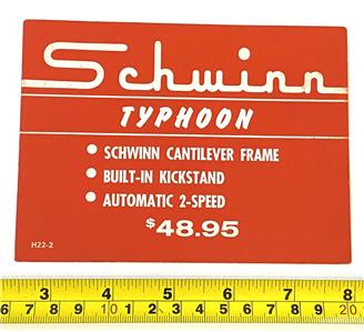 New old stock price card for a Schwinn Typhoon from a Schwinn bicycle shop. Cardboard, 4-1/4" x 5-3/4".