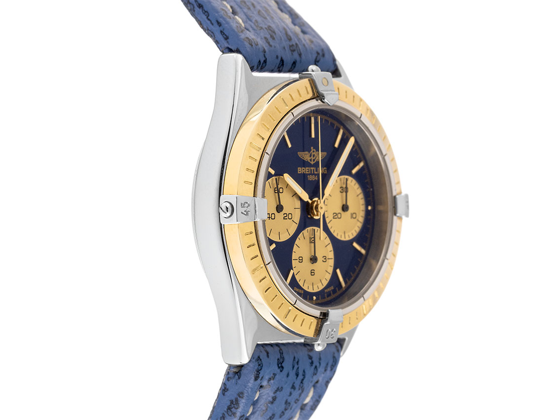 Gehäuse Edelstahl poliert. Gehäusedurchmesser ohne Krone 36mm, Gehäusehöhe 12,5mm. Lünette Gelbgold poliert mit Edelstahl Reitern und 60-Minuten Skala. Armband Leder blau mit Ziernaht, Anstoßbreite 18mm, Faltschließe Edelstahl mit Hersteller-Logo. Zifferblatt blau mit aufgesetzten gelbgoldenen Indexen und gelbgoldenen Zeigern. Uhrwerk Handaufzug, Kaliber Breitling 11, Basis Lemania 1873 mit 17 Edelsteinen. Anzeige von Stunde und Minute über Zeiger aus der Mitte, kleine Sekunde bei 9 Uhr. Saphirglas kratzfest. Krone geriffelt mit Flankenschutz. Boden Edelstahl verschraubt und graviert. Gewicht der Uhr inklusive Armband 76g. Referenznummer: B11045, Gehäusenummer: 24XXX, Baujahr: 1998, ID: P823426000823H-4200, Artikelnummer: 10000071089. Mit Uhrwerk Revision und kompletter äußerlicher Aufarbeitung von März 2025, inkl. 1000 Tagen Garantie. Original Breitling Reisebox. Wie Neu. Lieferzeit sofort.