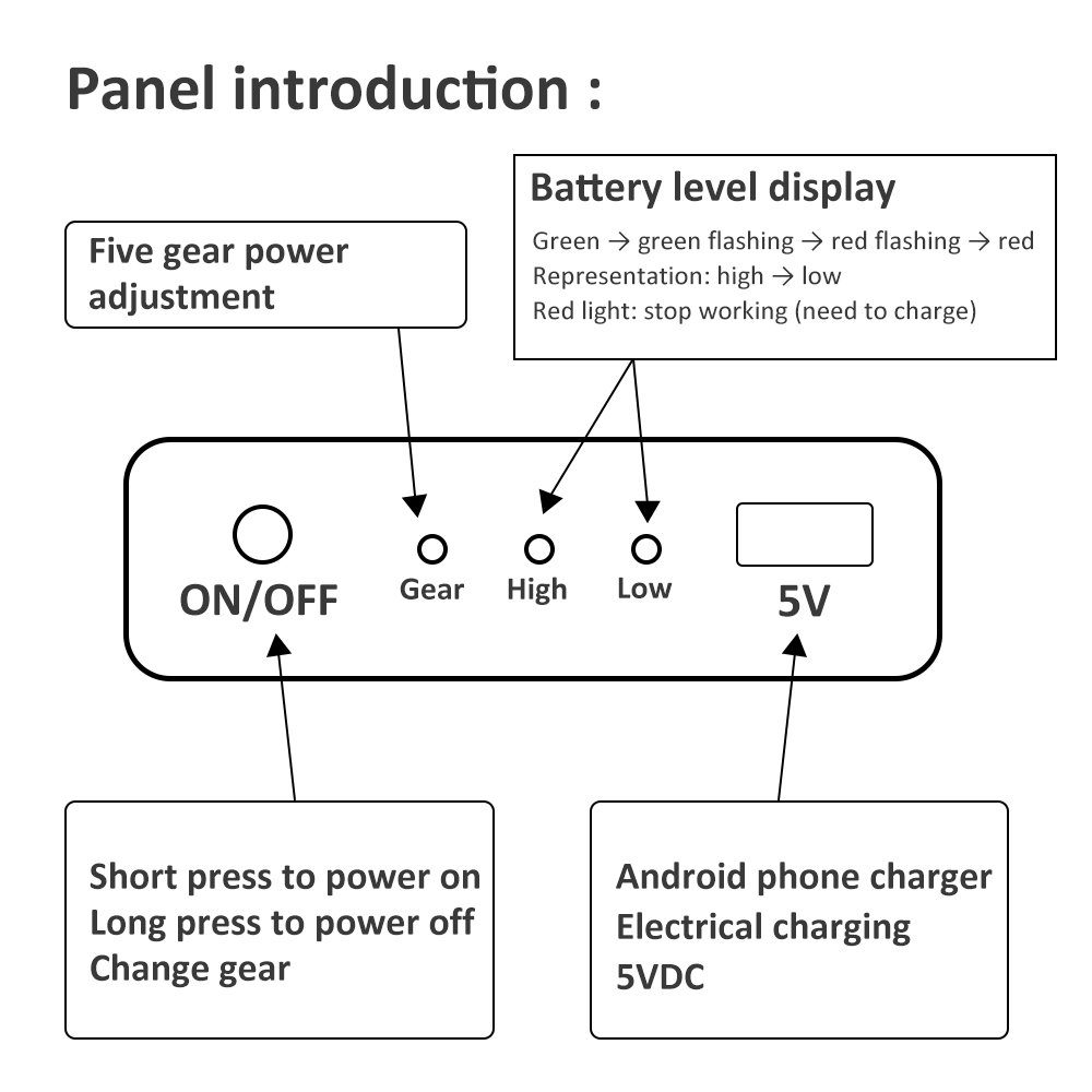Five gears of power can be adjusted, short press the button to control, blue light indicator