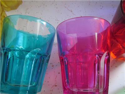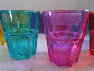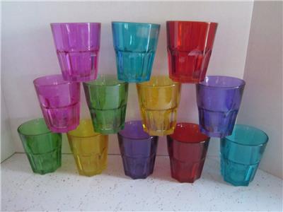Set of 12 short highball glasses made by ARC France. Beautiful multi or jewel colors. HAND WASH as these are colored on the glass, the glass is not colored in the manufacturing process so color will wear off if put in dishwasher. Each measures about 4" tall and 3 3/8" top diameter. Very heavy glass. There is residue from stickers on 1 of the glasses as shown - one has paint loss where sticker was removed. I have not tried to remove as these are painted and finish may come off with vigorous scrubbing. Leaving this up to the buyer. All 12 pieces in excellent, pre-owned condition - no chips/cracks and paint is good except where sticker residue is on 2. I also have the matching set of tall water/tea glasses for sale in another listing.