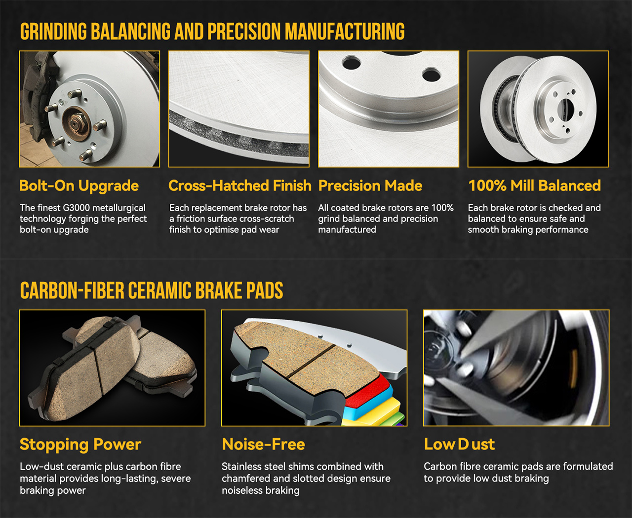 Features: Safe Braking: Our ceramic brake kit ensures superior noise-free braking and exceptional vibration control, enhancing the safety of your driving experience. The rotors are crafted from high-quality G3000 cast iron and are 100% precision-cut to minimize dust and provide a smooth surface for optimal braking performance, thus ensuring strength, stability, and durability. Low-Dust & Low-Noise: Ceramic brake pads offer quieter operation compared to metallic alternatives and have a service life that is twice as long. A proprietary formula reduces dust emissions by 30%, while the silver-zinc dichromate coating on the brake discs prevents rust and corrosion, maintaining the aesthetic appeal of the wheels even after extended use. Excellent Performance: Each component, including the pads and rotors, undergoes rigorous testing to meet or exceed SAE standards, ensuring reliable performance in all types of extreme conditions. Customized formulas are employed to guarantee quiet operation and enhanced stopping power. Customer Support: KAC has a longstanding commitment to the research, development, and manufacturing of automotive components, ensuring that all parts are 100% fit for the original vehicle. We provide a comprehensive 5-year warranty; should you encounter any issues, please do not hesitate to contact us for assistance.