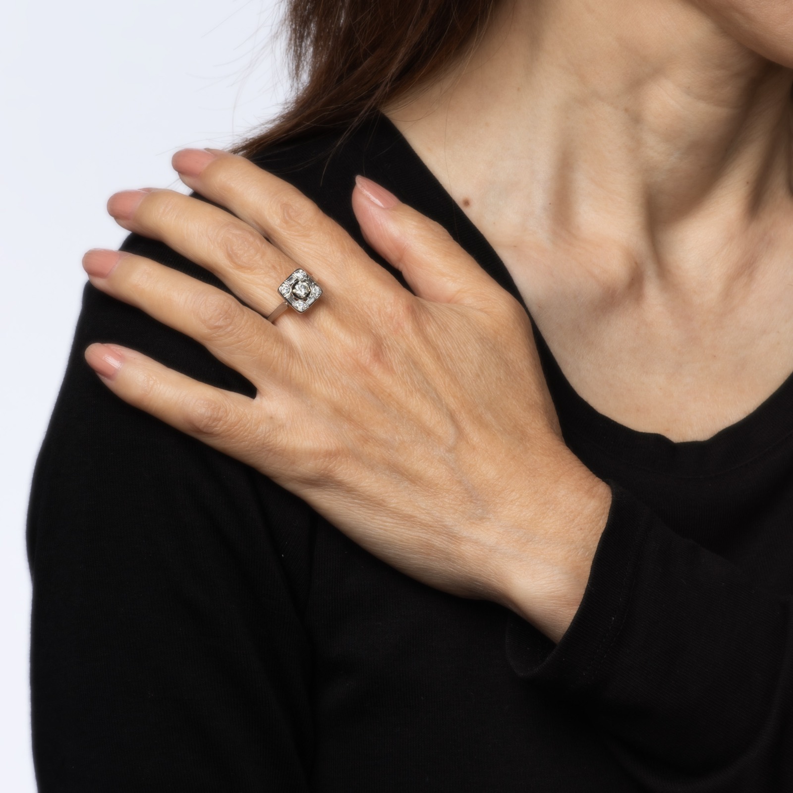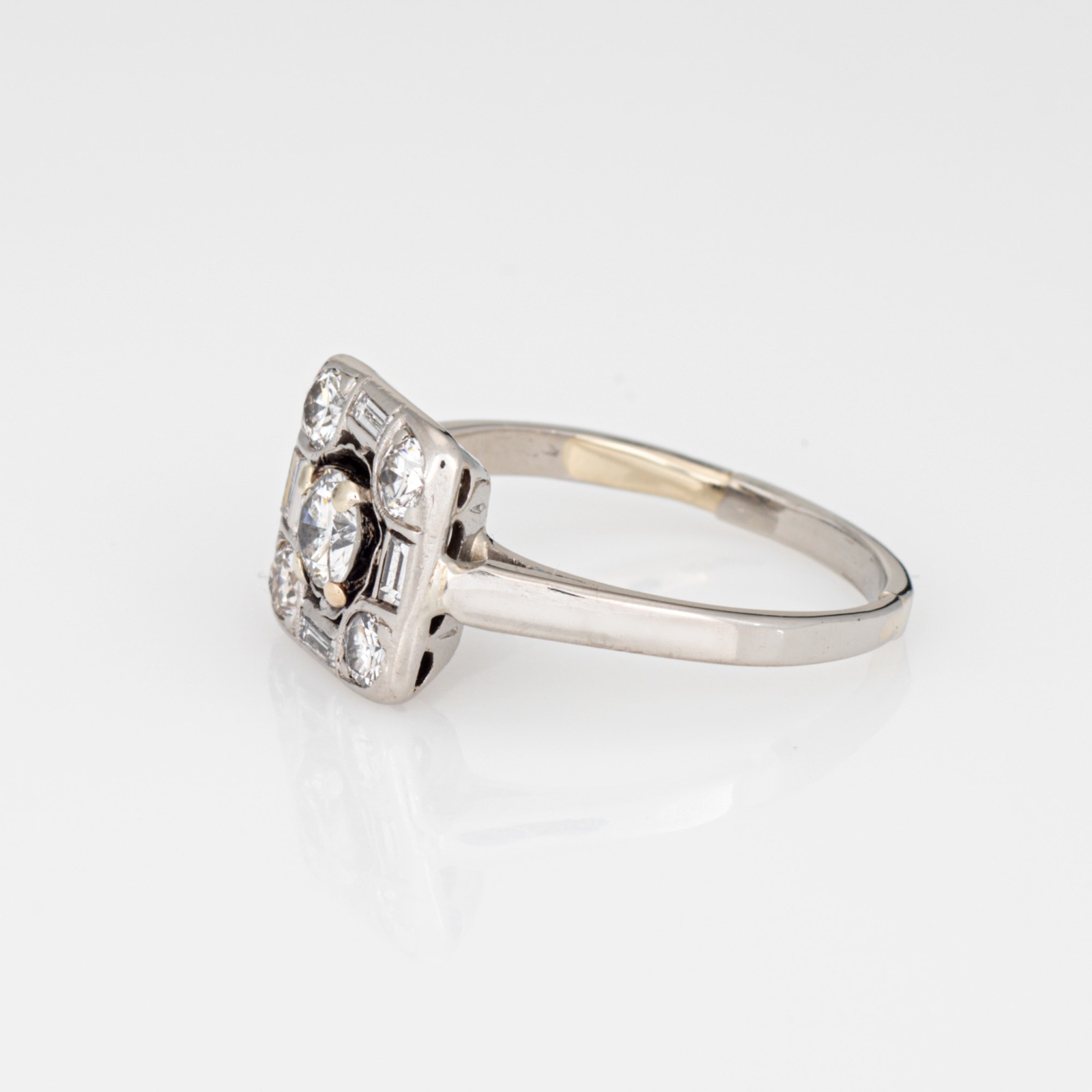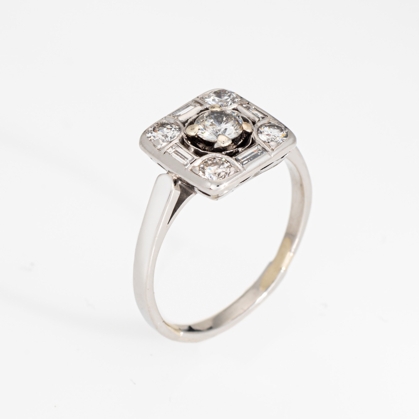 The stylish ring is set with mixed cut diamonds in a square mount. The ring would make a lovely vintage alternative engagement or right hand ring for everyday wear. The ring has a lower profile and rises 4mm from the finger (0.15 inches).