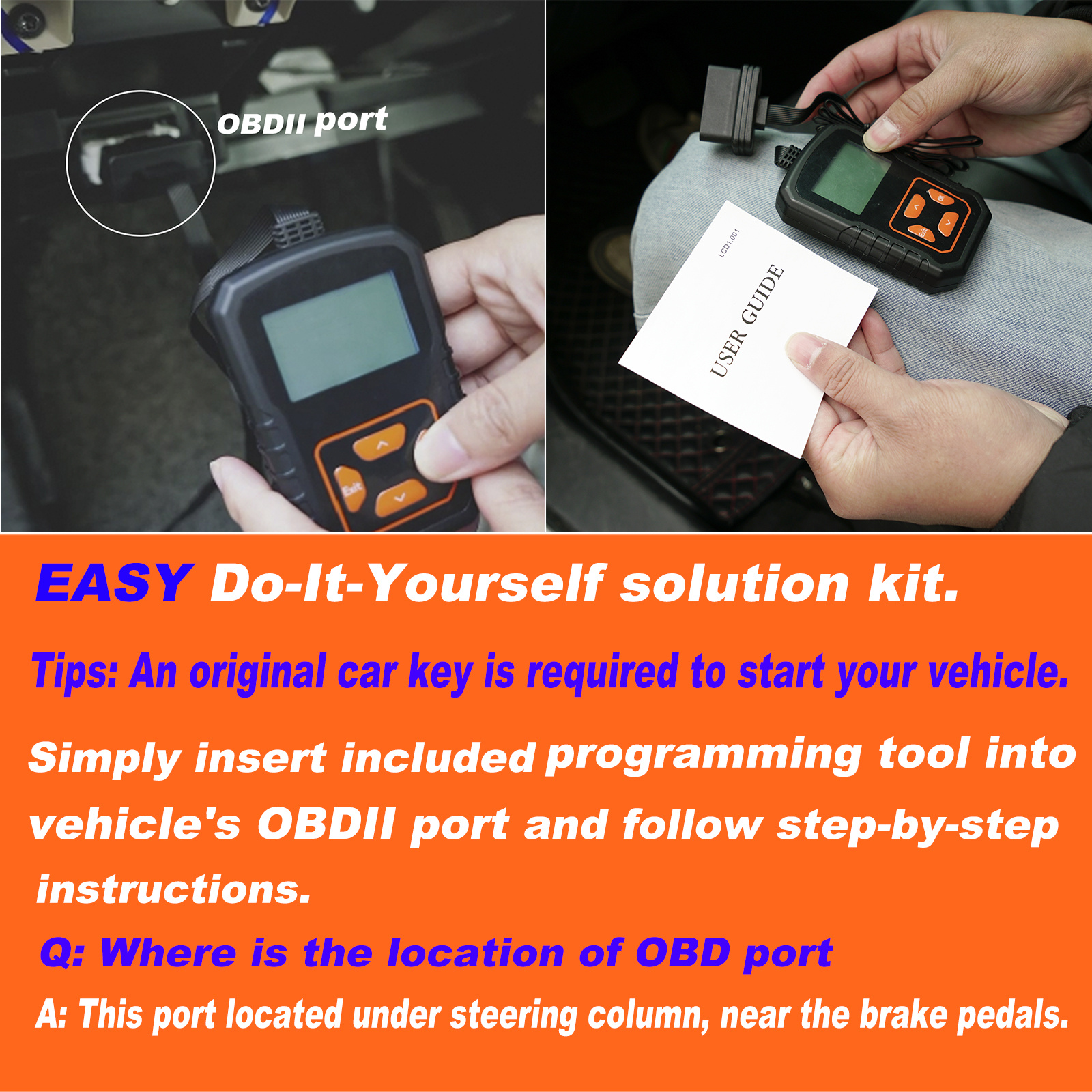 Note: 1. Easily done in minutes with the user guide, save Money 2. Do it yourself to get new key with Programmer, Fast Set. 3.You need an original key to start your vehicle and install. 4. Just plug the tool into the OBD2 port ,follow directions exactly. 5. OBD Tool can be programmed unlimited times for locked vehicle. 6. Once the OBD interface is used, it cannot be used on another vehicle. 7. key blade need cut at hardware store or locksmith. 8. Please check the same FCCID and buttons with your key. 9. Please contact us firstly instead of opening a return request. we will solve the problem.