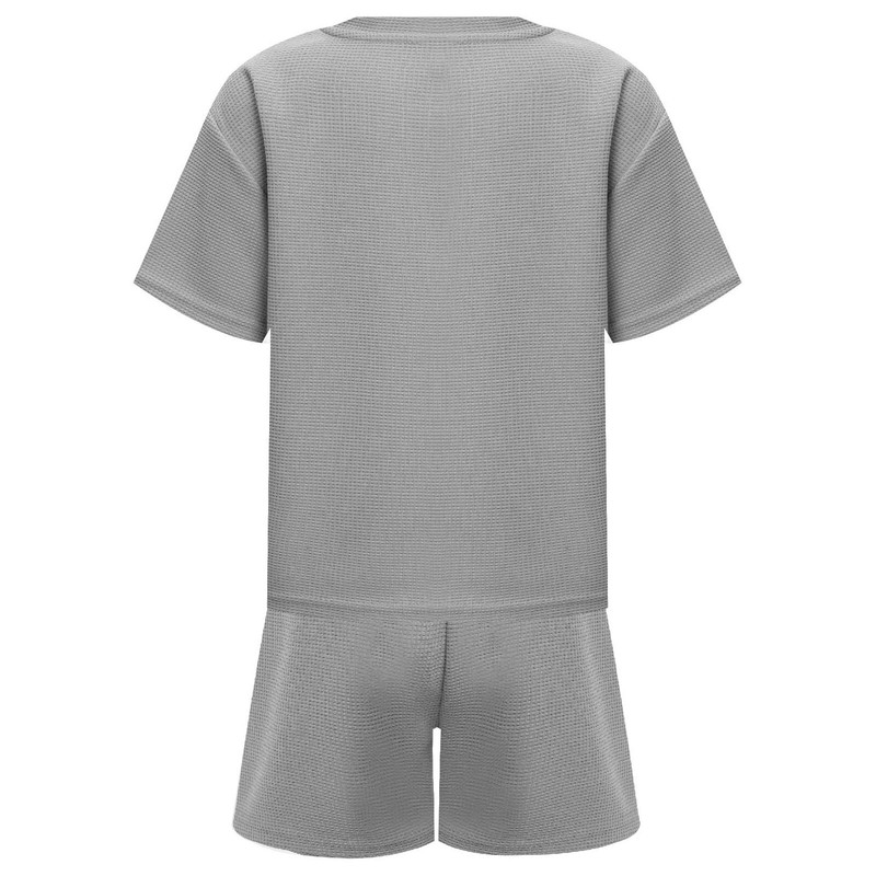 Waffle texture make this solid color sports set look simple but stylish. Set include round neck short sleeve T-shirt and shorts.