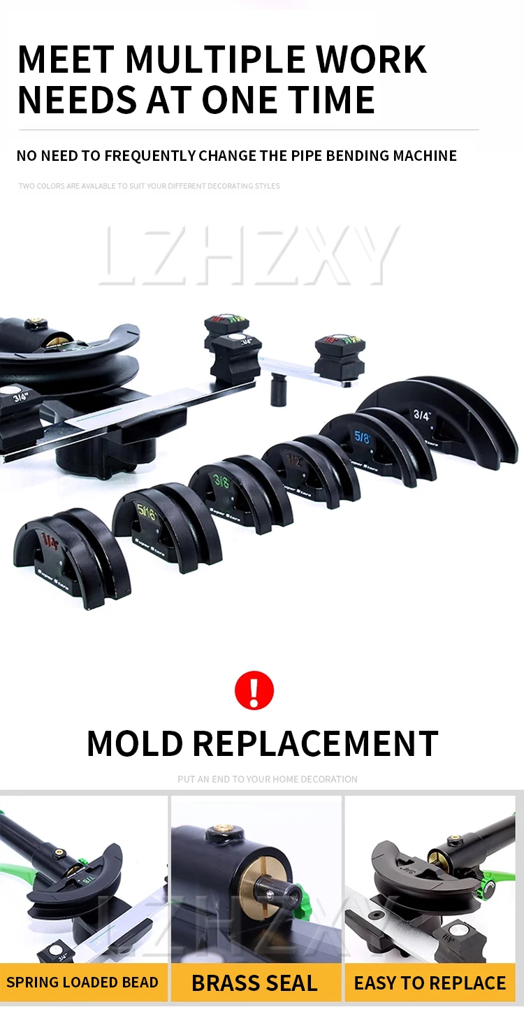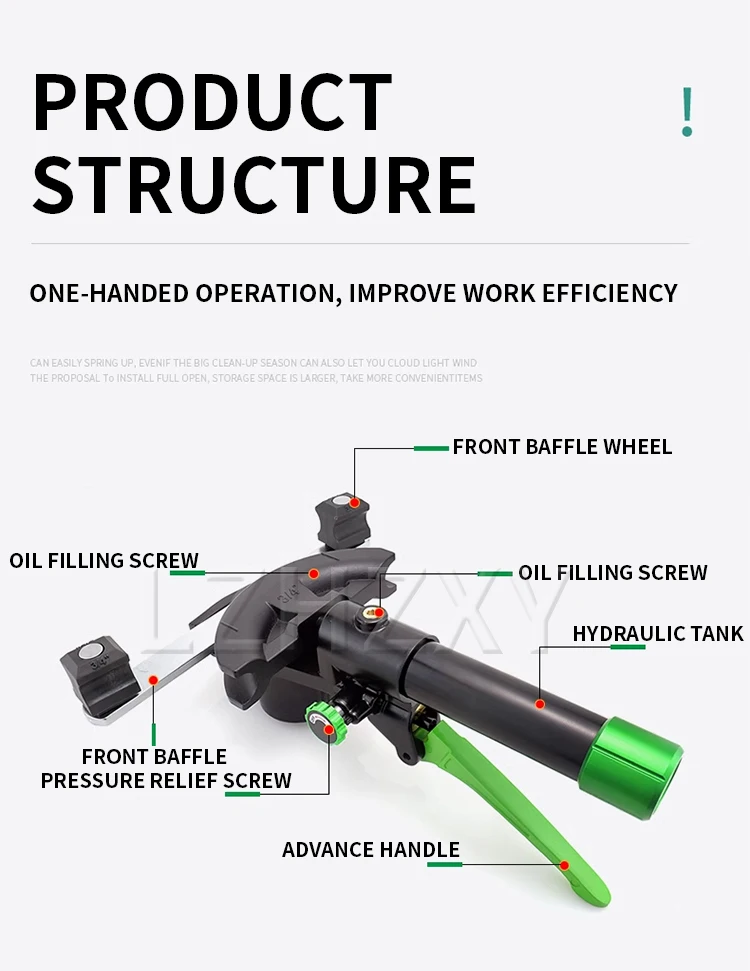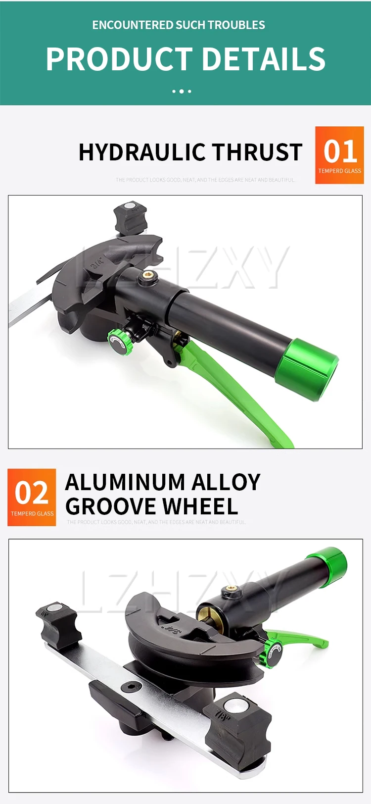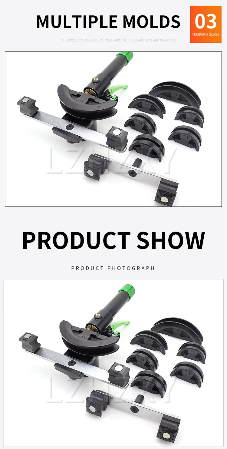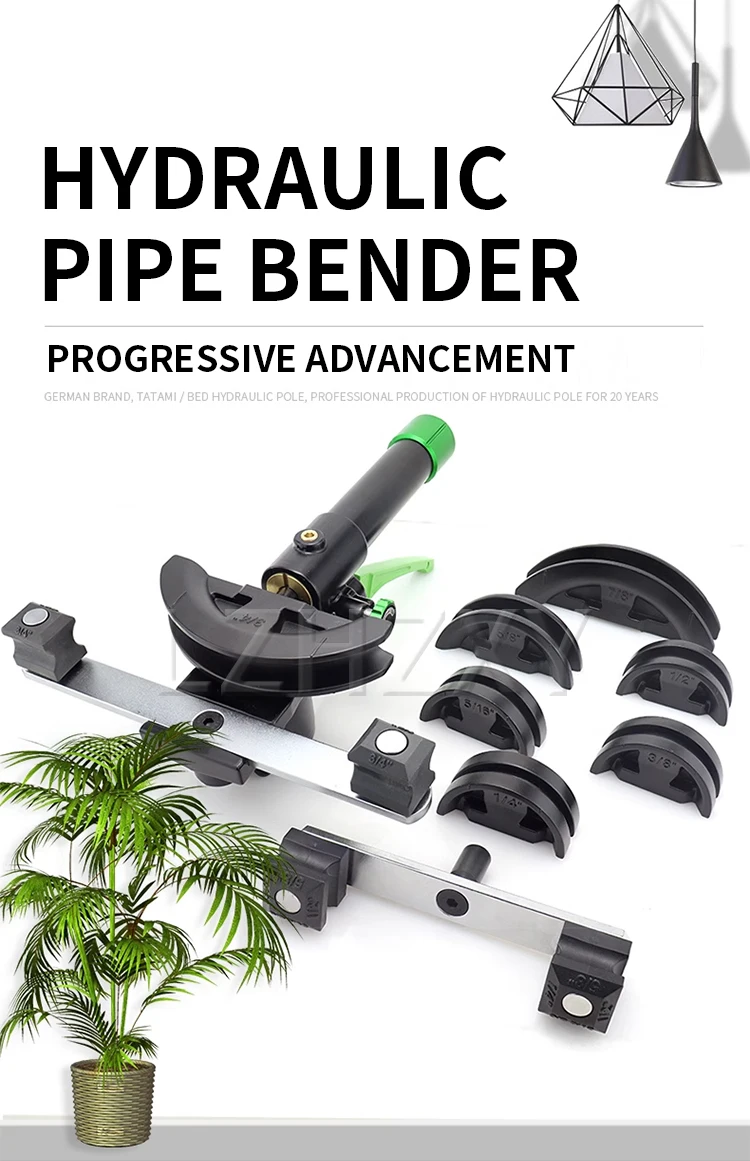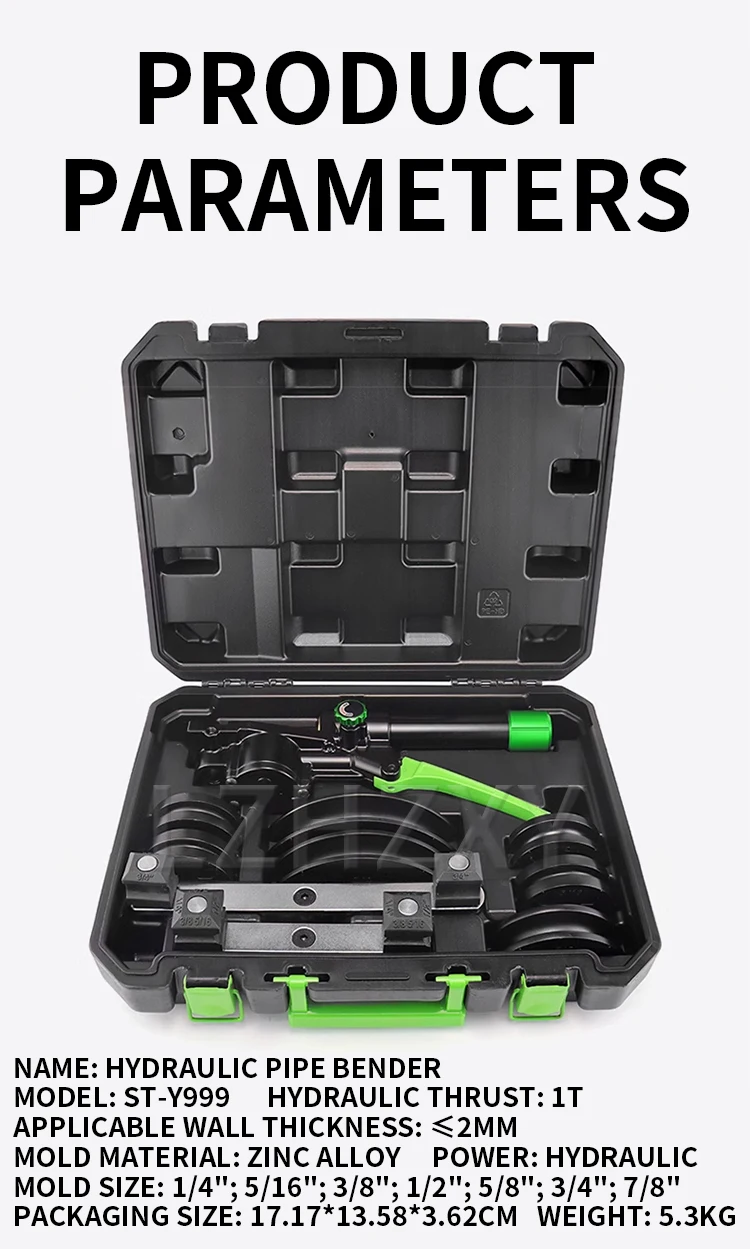 Name: Hydraulic pipe bender Model: ST-Y999 Hydraulic thrust: 1T Applicable wall thickness: ≤2MM Mold material: zinc alloy Power: hydraulic Mold size: 1/4"; 5/16"; 3/8"; 1/2"; 5/8"; 3/4"; 7/8" Packaging size: 17.17*13.58*3.62CM Weight: 5.5KG