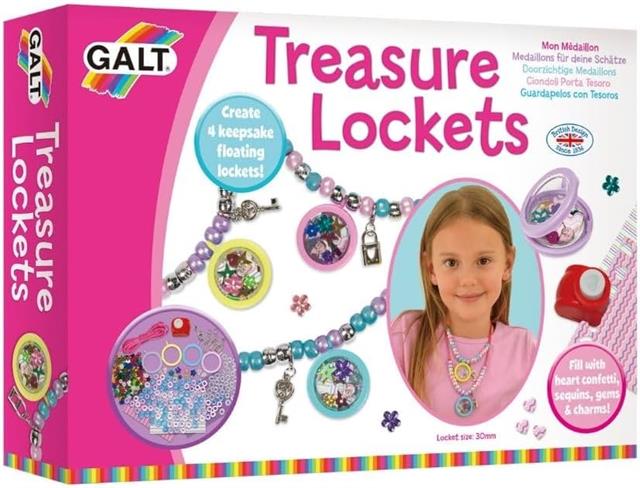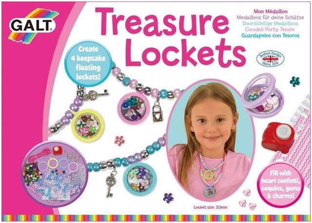 Product Description: Create beautiful and personalized keepsake lockets with the Galt Toys Treasure Lockets Kit. Designed for children aged 5 to 10, this craft set offers a fun and creative way to make lockets adorned with charms, gems, and sequins. The kit includes everything needed to design 4 unique lockets, making it a perfect activity for young jewelry enthusiasts. Kids can use the included heart punch to create heart-shaped confetti, add floating charms, and personalize each locket with their own treasures.