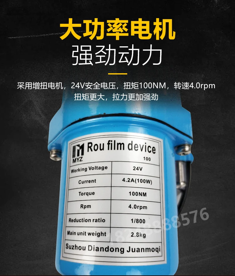 Name: 24V electric film winding machine Type: 24V single motor/one control one combination Voltage: DC24V Power: 100W Output speed: 4.5R/M Torque: 100N.M Net weight: 2.8kg Roll height: 2 meters