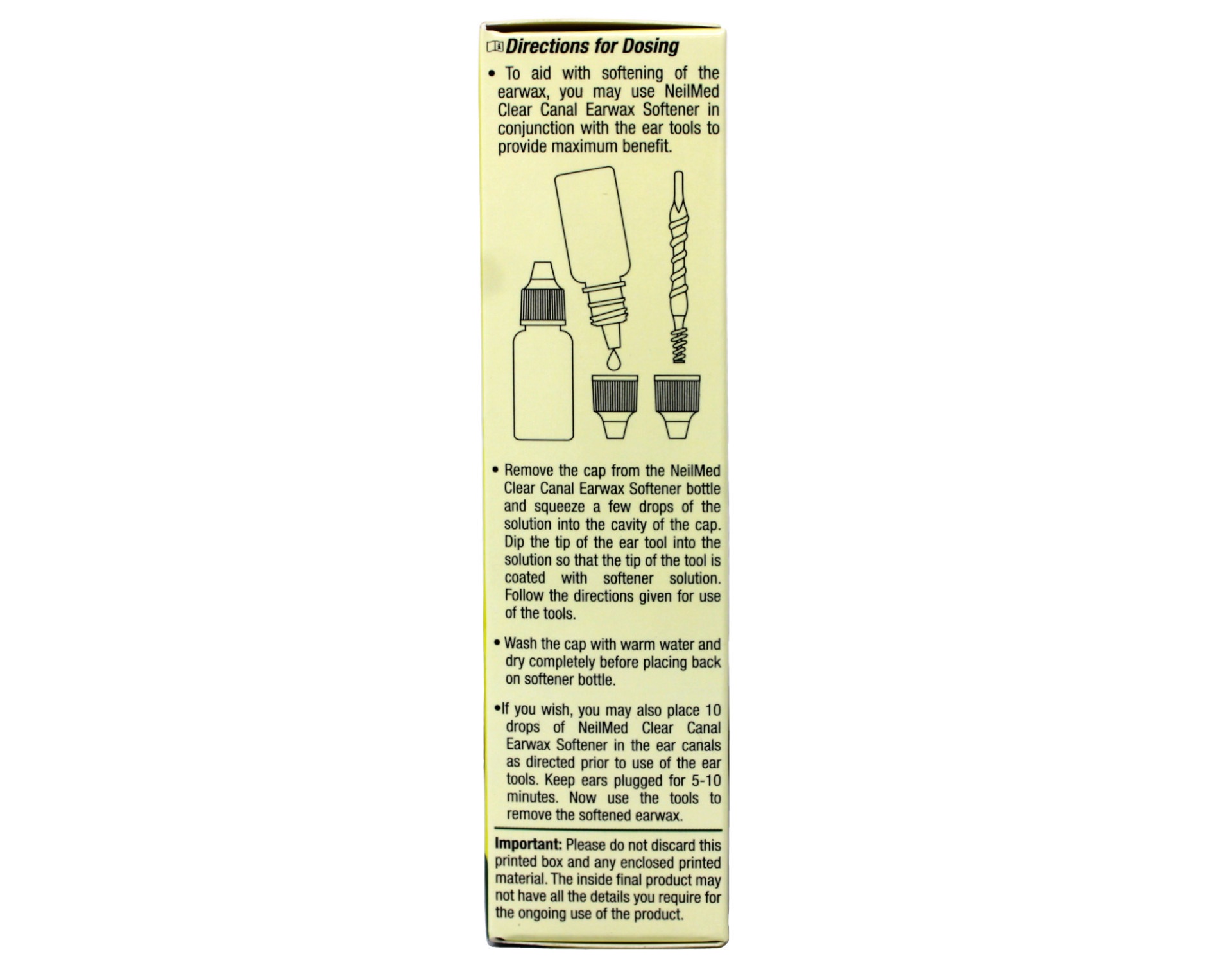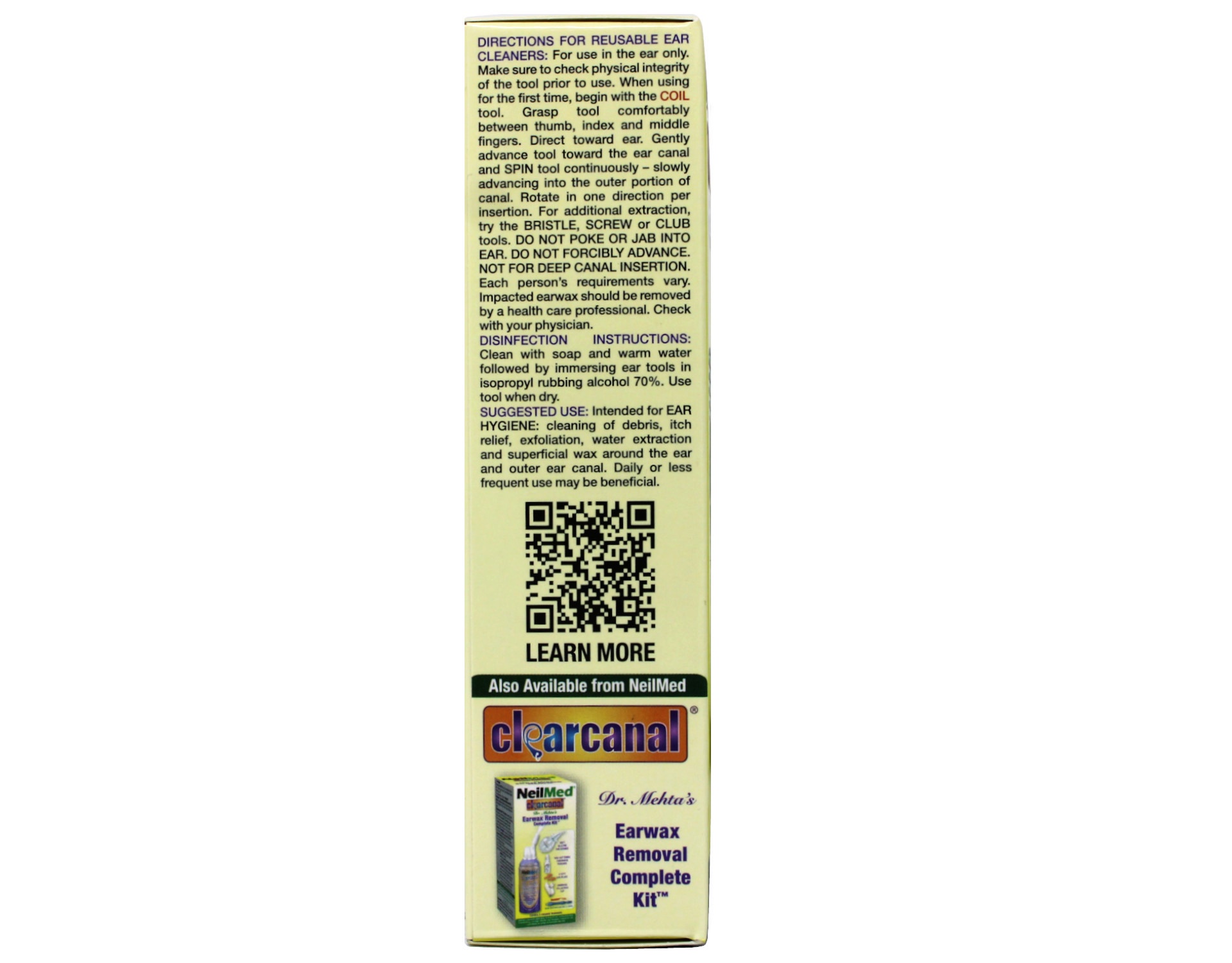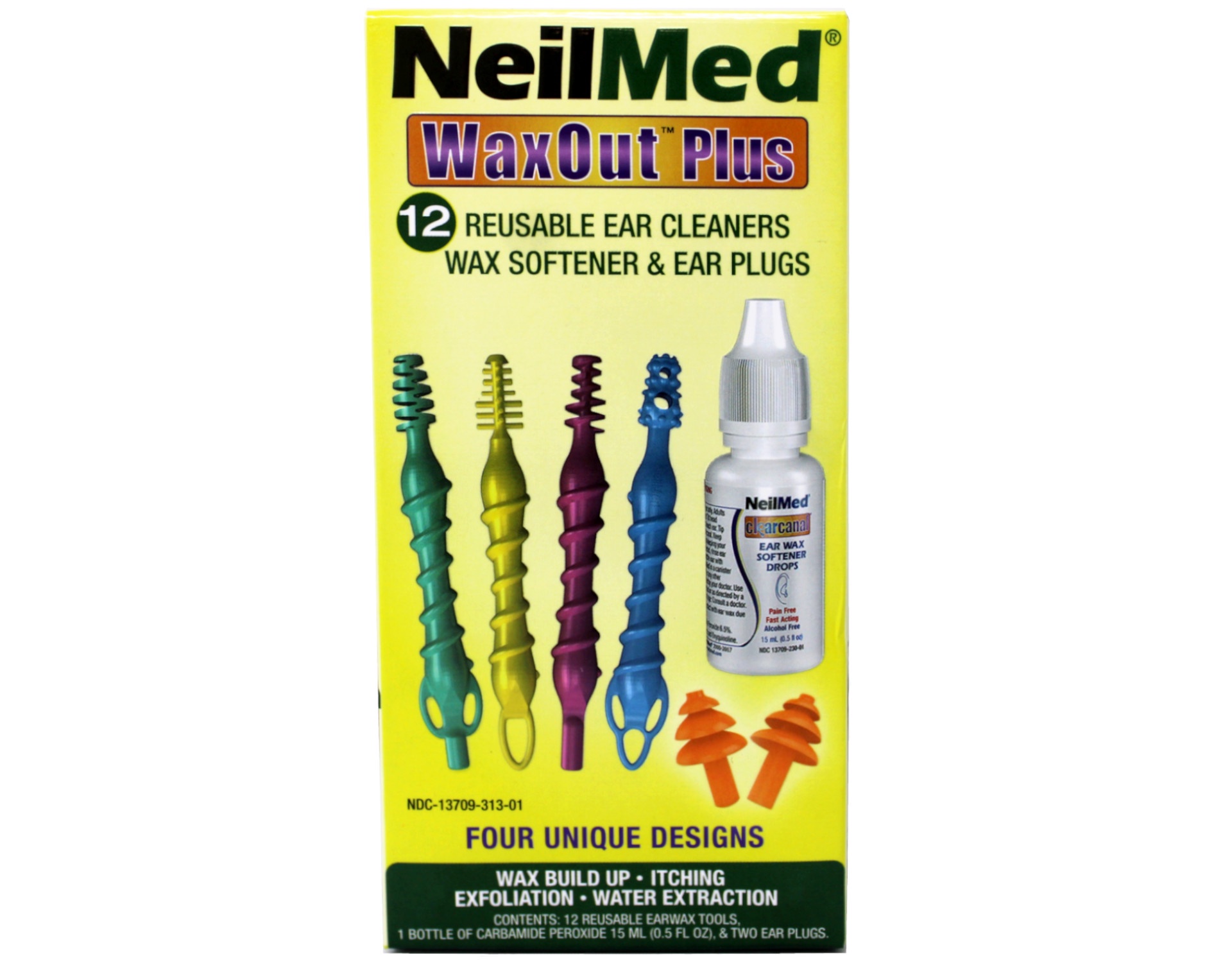 NeilMed WaxOutTMPlus Reusable Flexible Ear Cleaners with Wax Softener and Ear Plugs 12 Reusable Ear Cleaners, Wax Softener & Ear Plugs. Complete Ear Hygiene System For: Wax Build Up - Itching - Water Extraction - Exfoliation Coil The Coil contains Interlocking rolls that compress to help collect and loosen material, as well as extract water – the Coil functions as the perfect cotton-swab replacement. Bristle The Bristle is comprised of a collection of different fiber lengths and thicknesses tohelp loosen and collect material and debris, as well as aiding in itch relief. Screw The Screw works by boring into, displacing, and helping to collect material and debrislaterally into the ridges – moving it out of the ear canal. Club The Club is designed with a stubby, bumpy surface with perforations leading to a central cavity to help detach, dislodge, and collect material and debris, while also working to exfoliate the ear canal. Contents: 12 reusable earwax tools 1 bottle of carbamide peroxide 15 ml (0.5 fl oz) ear wax softener Two ear plugs. DIRECTIONS FOR REUSABLE EAR CLEANERS: For use in the ear only. Make sure to check physical integrity of the tool prior to use. When using for the first time, begin with the COIL tool. Grasp tool comfortably between thumb, index and middle fingers. Direct toward ear. Gently advance tool toward the ear canal and SPIN tool continuously – slowly advancing into the outer portion of canal. Rotate in one direction per insertion. For additional extraction, try the BRISTLE, SCREW or CLUB tools. DO NOT POKE OR JAB INTO EAR. DO NOT FORCIBLY ADVANCE. NOT FOR DEEP CANAL INSERTION. Each person’s requirements vary. Impacted earwax should be removed by a health care professional. Check with your physician. DISINFECTION INSTRUCTIONS: Clean with soap and warm water followed by immersing ear tools in isopropyl rubbing alcohol 70%. Use tool when dry. SUGGESTED USE: Intended for EAR HYGIENE: cleaning of debris, itch relief, exfoliation, water extraction and superficial wax around the ear and outer ear canal. Daily or less frequent use may be beneficial. DIRECTIONS FOR DOSING: To aid with softening of the earwax, you may use NeilMed Clear Canal Earwax Softener in conjunction with the ear tools to provide maximum benefit. Remove the cap from the NeilMed Clear Canal Earwax Softener bottle and squeeze a few drops of the solution into the cavity of the cap. Dip the tip of the ear tool into the solution so that the tip of the tool is coated with softener solution. Follow the directions given for use of the tools. Wash the cap with warm water and dry completely before placing back on softener bottle. If you wish, you may also place 10 drops of NeilMed Clear Canal Earwax Softener in the ear canals as directed prior to use of the ear tools. Keep ears plugged for 5-10 minutes. Now use the tools to remove the softened earwax.