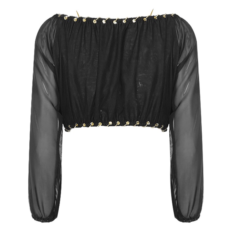 Long sleeve crop top is decorated with beads and sequins, it makes a really fun noise when you dance.