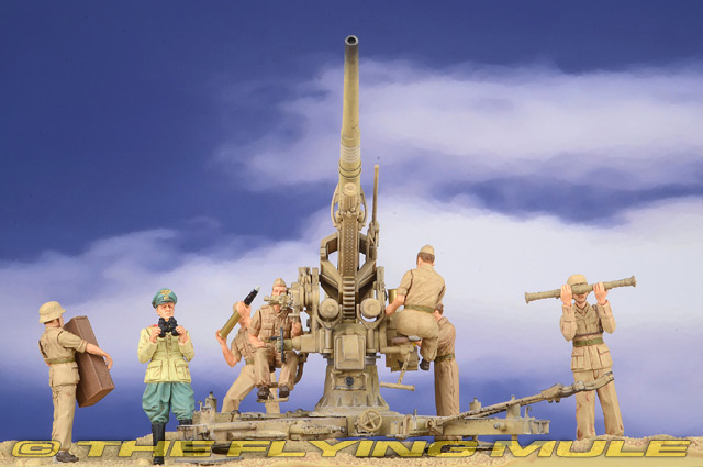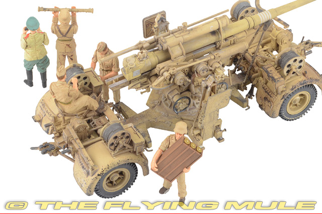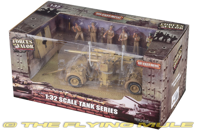 The German 88mm anti-tank artillery gun became infamous during WW2 for its ability to not only target allied armoured units but also airplanes and warships. This led to the technology and design for the 88mm being worked into the Tiger tank series of mighty weaponry. In post war interviews with allied troops, they claimed that the 88mm "FlaK Gun" was an unfair weapon to be deployed in ground warfare. The word "FlaK" is a contraction of German Flugzeugabwehrkanone meaning "aircraft-defense cannon". There were four major phase variations of the FlaK gun that were issued model numbers 18, 36, 37 and 41. The 18's barrel was constructed from a single piece of steel. As the gun was mainly used for targetting aircraft, particularly bombers, this turned out to be a major flaw as the fire rate required to hit and bring down allied aircraft would form cracks along the barrel's surface. To counter this problem, the German army developed the 36 model with a sectional barrel to help the longevity of the gun and the speed at which it could be repaired. Due to supply shortages, particularly when the war started to turn against the Germans, many combinations of gun and cruciform base were used together. For instance, the FlaK 18 gun could be combined with the FlaK 36 cruciform and vice-versa. Krupp 88mm FlaK 18The 88 mm gun was developed as early as 1928 by Krupp of Essen, and entered production after Hitler's rise to power in 1933. The '88' proved itself to be an excellent anti-aircraft gun and a feared tank killer relying on power and range rather than concealment. It could knock out any Allied tank at distances well over 1000 meters. The series of anti-aircraft guns officially called the 8,8 was mounted on a pivoted cruciform carriage, which was carried by two single axle trailers, pulled by another vehicle and could be quickly dismounted and stationed in the field or fired while trailered.© Copyright 2003-2026 The Flying Mule, Inc. Forces of Valor's 1:32 scale 88mm FlaK Guns are some of the most intricately detailed models in Forces of Valor's 1:32 scale armor series. The guns are fitted with a set of removable twin carriages and loaded with details such as rotating wheels, mounting mechanisms and an operator's station. The metal barrel with simulated recoiling action pivots near vertical and the entire gun assembly spins 360 degrees on the base, with dial handles that are keyed to spin with each action. An all metal gun shield installs easily when the model is configured for engaging ground targets. A set of five detailed figures are poised to man the gun. © Copyright 2003-2026 The Flying Mule, Inc. Forces of Valor Armored Fighting VehiclesThe Waltersons "Forces of Valor" range presents detaled, ready-made diecast models of military vehicles.Waltersons "Forces of Valor" diecast vehicles feature: