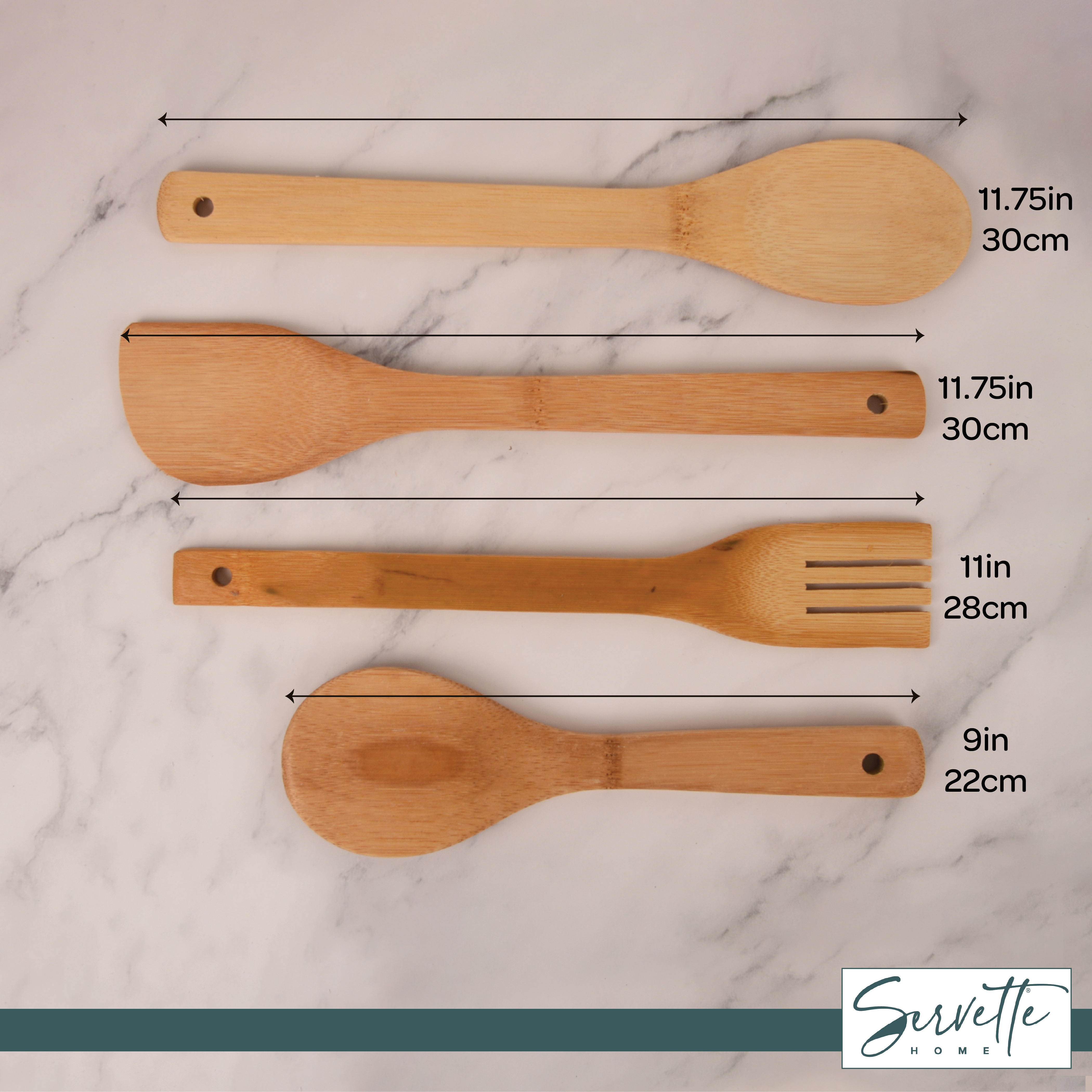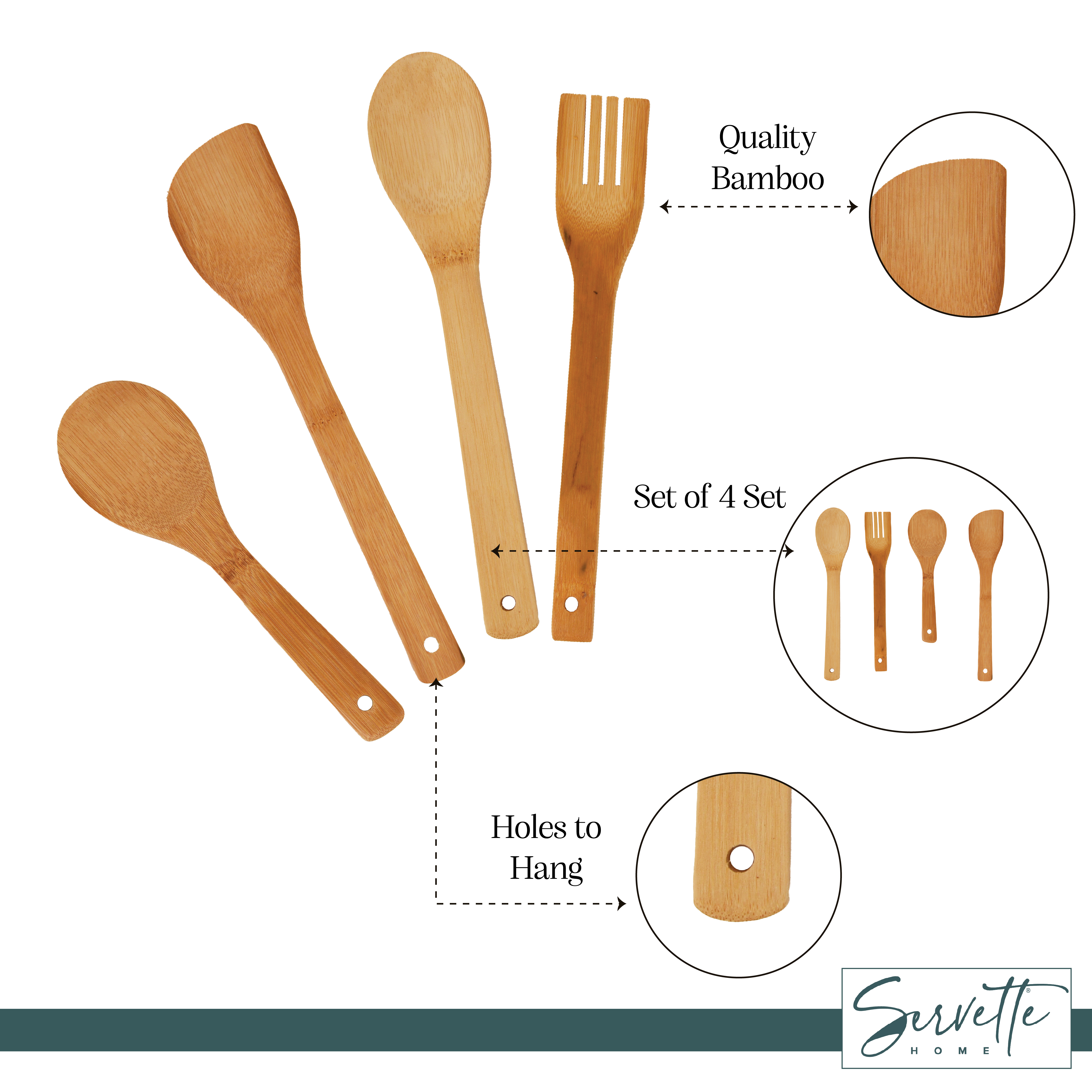 Elevate your cooking experience with this versatile 4-piece kitchen utensil set. Crafted from premium bamboo, these essential cooking tools combine traditional charm with modern functionality. The set includes 2 spoons for stirring and serving, a versatile spatula for flipping and turning, and a fork for precise control while cooking. Each utensil is carefully constructed to be gentle on your cookware while providing excellent control and comfort during use. The natural bamboo construction offers durability and a beautiful aesthetic that adds warmth to any kitchen. This comprehensive set covers all your basic cooking needs, from stirring sauces to flipping pancakes. These kitchen tools make an excellent addition to any home cook's collection or a thoughtful housewarming gift.