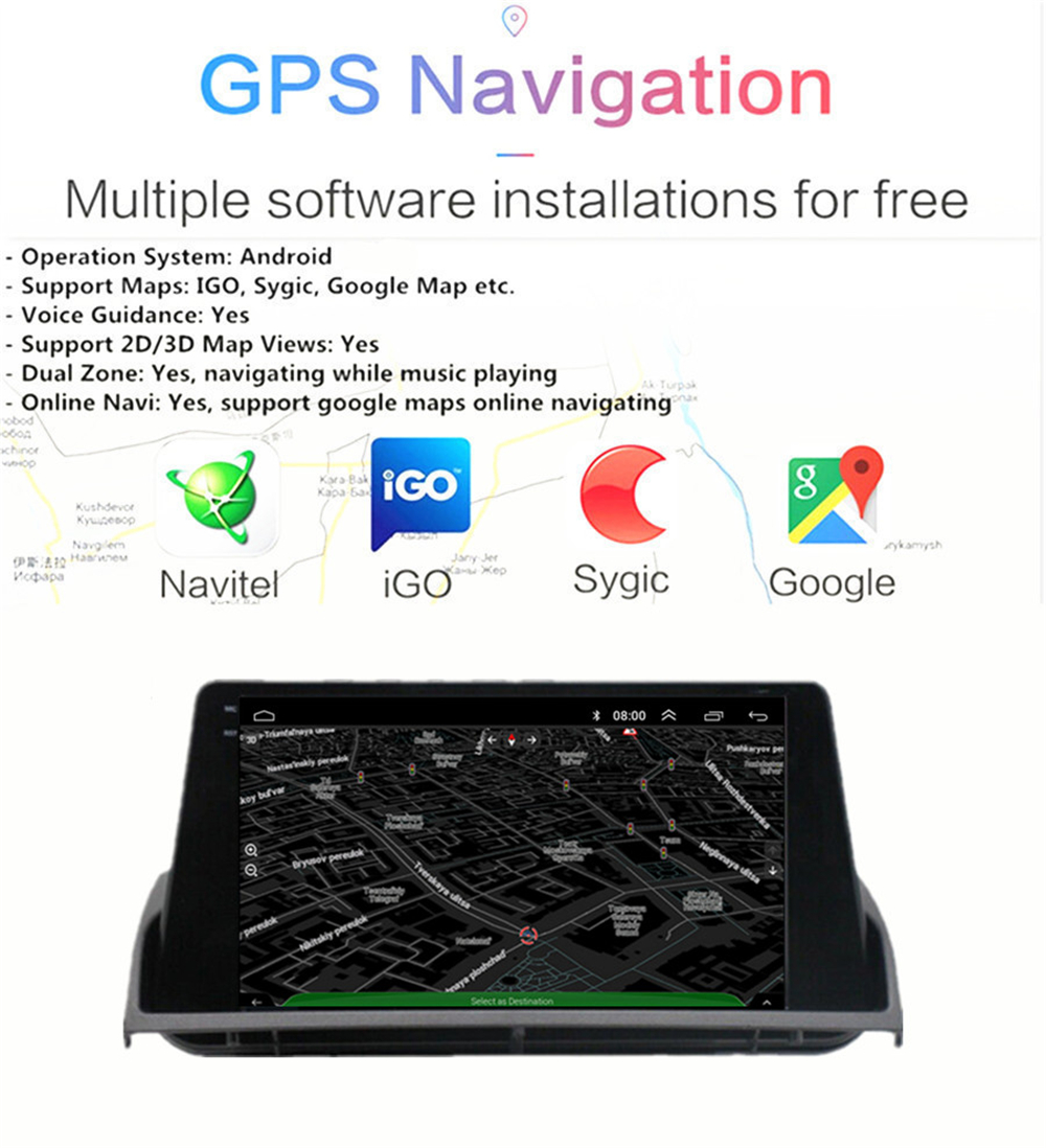 - Operation System: Android 12 - Support Maps: IGO, Sygic, Google Map etc. - Voice Guidance: Yes - Support 2D/3D Map Views: Yes - Dual Zone: Yes, navigating while music playing - Online Navi: Yes, support google maps online navigating |