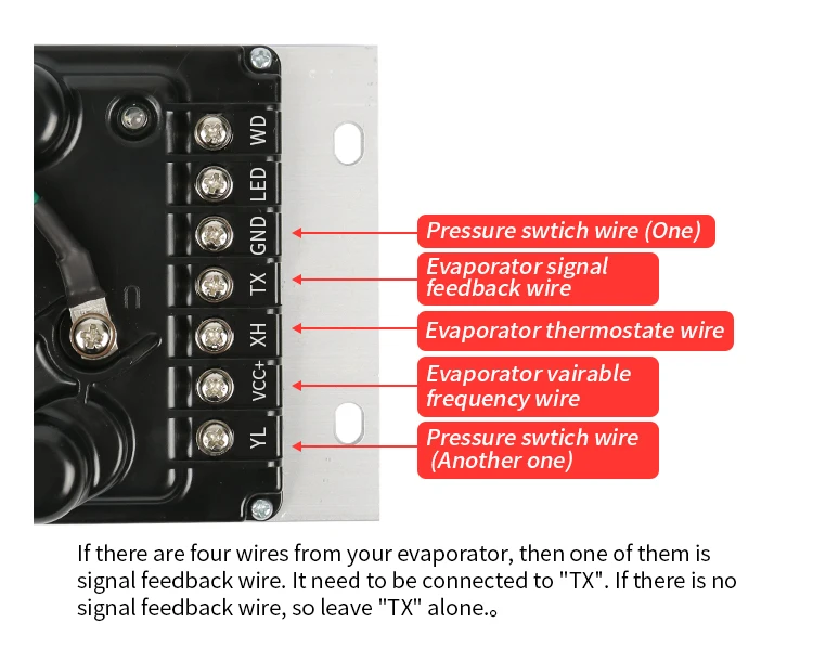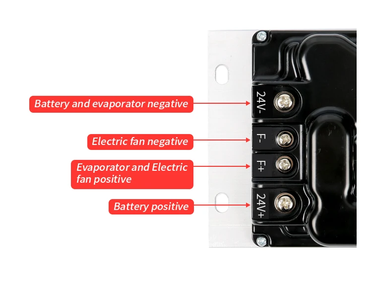 3. Evaporator (Inside unit) wire. If you don't need the wire socket, you can cut it. Red wire: Evaporator positive. Black wire: Evaporator negative. Blue wire: Evaporator thermostat. (Normally there are three wires on the evaporator)