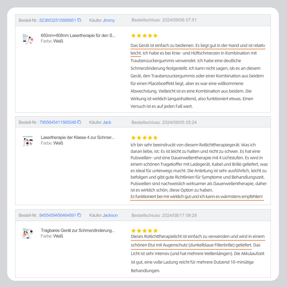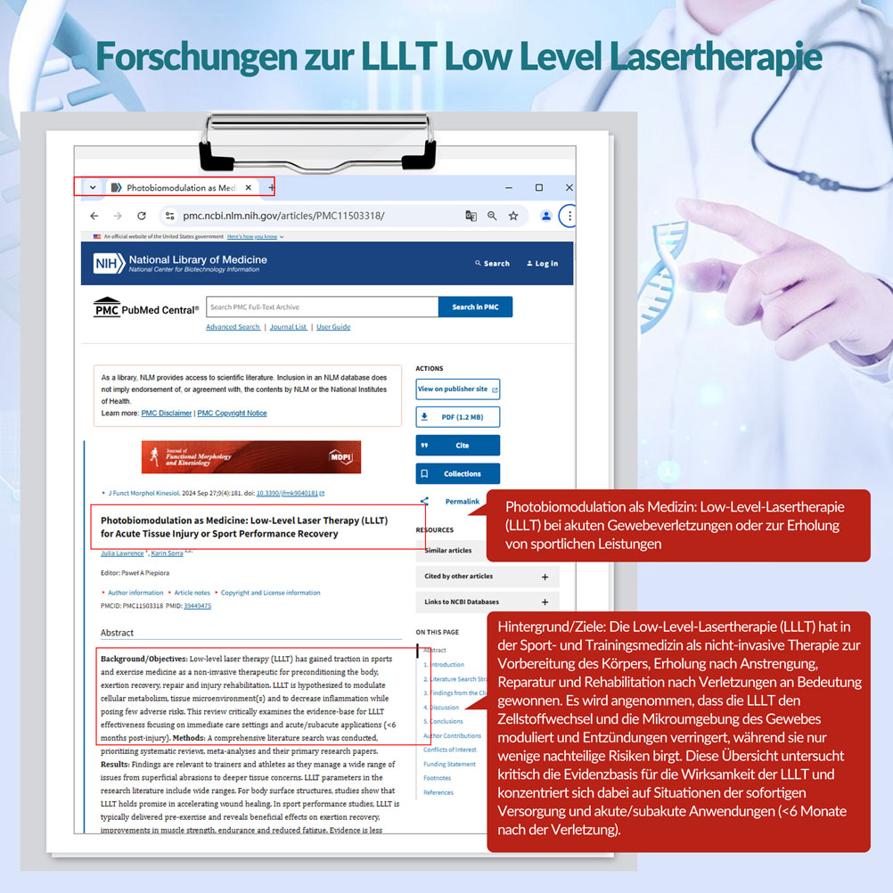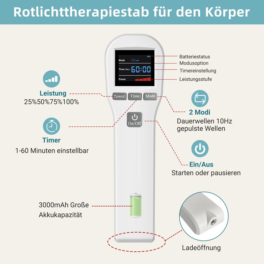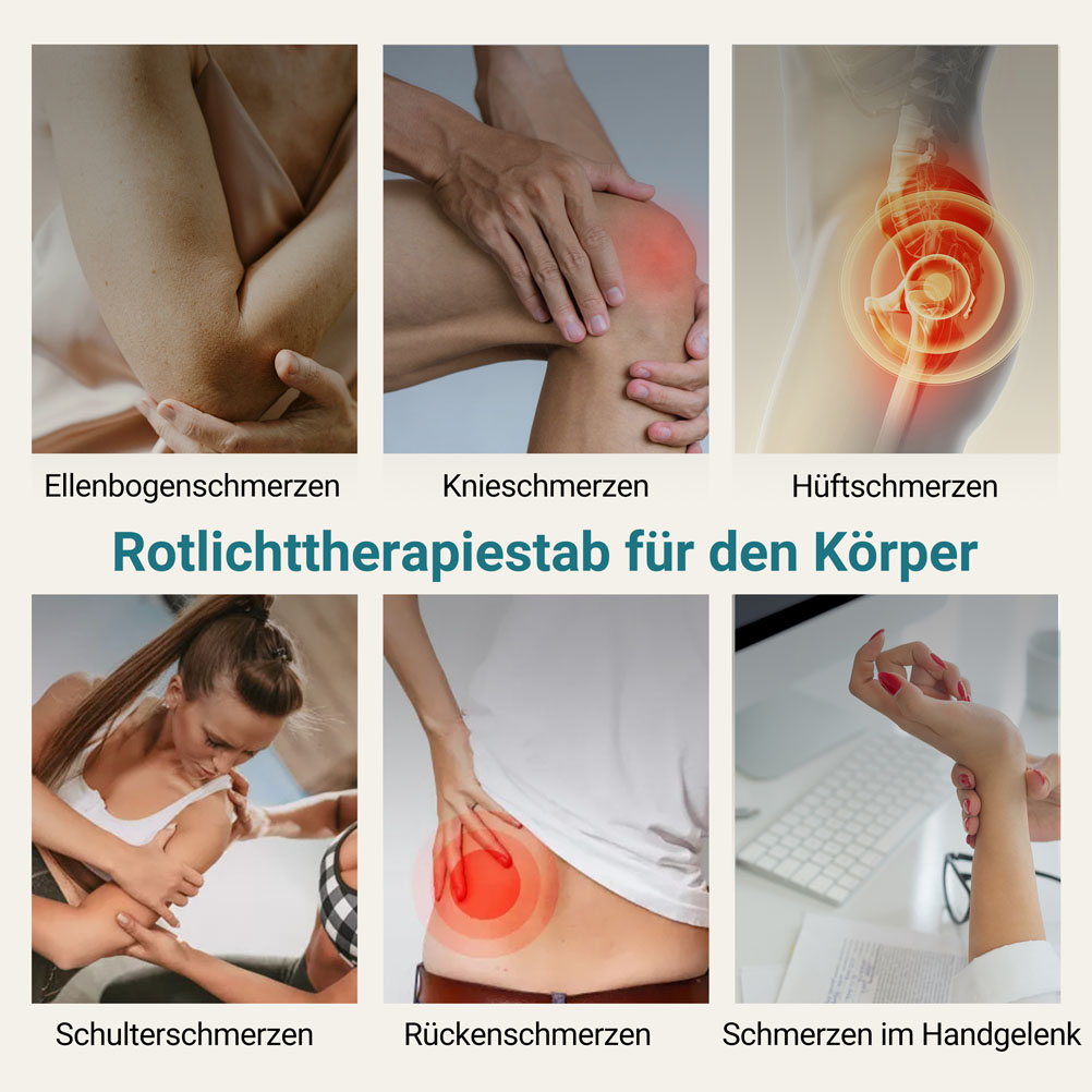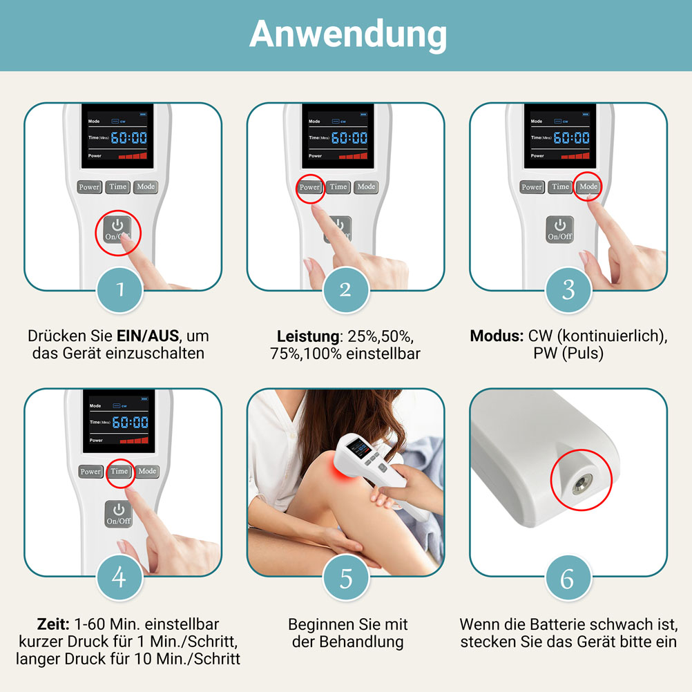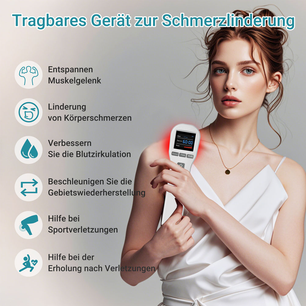 Die vom Gerät abgegebenen Lichtphotonen helfen bei der Schmerzlinderung und fördern die natürliche Heilung des Körpers. Entzündungen werden ebenfalls reduziert.