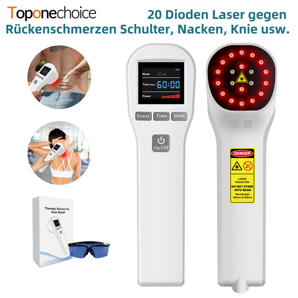 【Multifunktionen des Infrarotlichttherapiegeräts】Leistung: 220/440/660/880 mW, vier Stufen einstellbar (Klasse 4/3b); Zeit: 1 bis 60 Minuten einstellbar; Modus: CW-Dauerwelle und PW-Pulswelle bei 10 Hz einstellbar (Es gibt Belege dafür, dass PW für die meisten Anwendungen außer der Nervenregeneration besser ist als CW). (Hinweis: Drücken Sie lange auf Ein/Aus der schwachen Lasertherapie, um das Gerät ein-/auszuschalten, klicken Sie schnell auf Ein/Aus des schwachen Kaltlasers, um zu arbeiten). Kaltlaser gegen Schmerzen sollten 4–6 Wochen lang 1–2 Mal täglich für jeweils 20 Minuten verwendet werden (je nach körperlicher Verfassung).