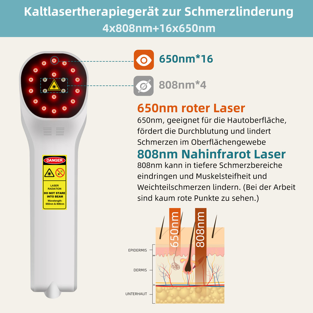 【Kaltlaser-LLLT-Kombination 650 nm + 808 nm】 Die 650 nm-Rotlichttherapie wirkt auf der Hautoberfläche und reduziert Entzündungen und Hautrötungen, stimuliert Akupunkturpunkte und lindert chirurgische Entzündungen. Die 808 nm Infrarotlichttherapie dringt tief in die Gewebeschicht ein und bietet Linderung bei tiefen Muskel- und Gelenkschmerzen wie Kniearthritis, zervikaler Spondylose, rheumatoider Arthritis, Schulterperiarthritis, Bandscheibenvorfall und vielem mehr. (Hinweis: 808 nm Infrarotrotlicht ist für das menschliche Auge unsichtbar, kann aber durch die Kamera des Telefons gesehen werden).