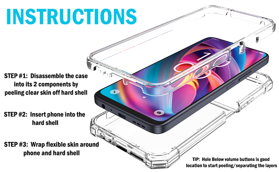 INSTALL INSTRUCTIONS: This is NOT a snap-on case. First disassemble the case into its 2 components. Begin by peeling back the flexible skin and remove the inner plastic shell from the case. (rectangle hole on side is good place to start). Once the two components are separated, insert your phone in the hard frame. (phone should be clean and remove any preexisting screen protectors) Now that your phone is nestled within the protective shell you can wrap the flexible skin around the hard shell. The complete install takes about 1-2 minutes but it's worth the wait. Your phone will be protected and safe!