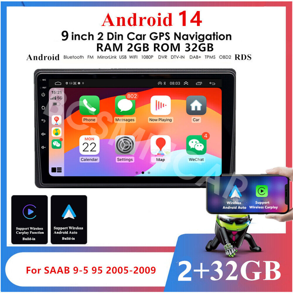 9" 2+32GB Android 14 Stereo Radio GPS Navigation FM WiFi Multimedia Player Head Unit Fit For For SAAB 9-5 95 2005-2011