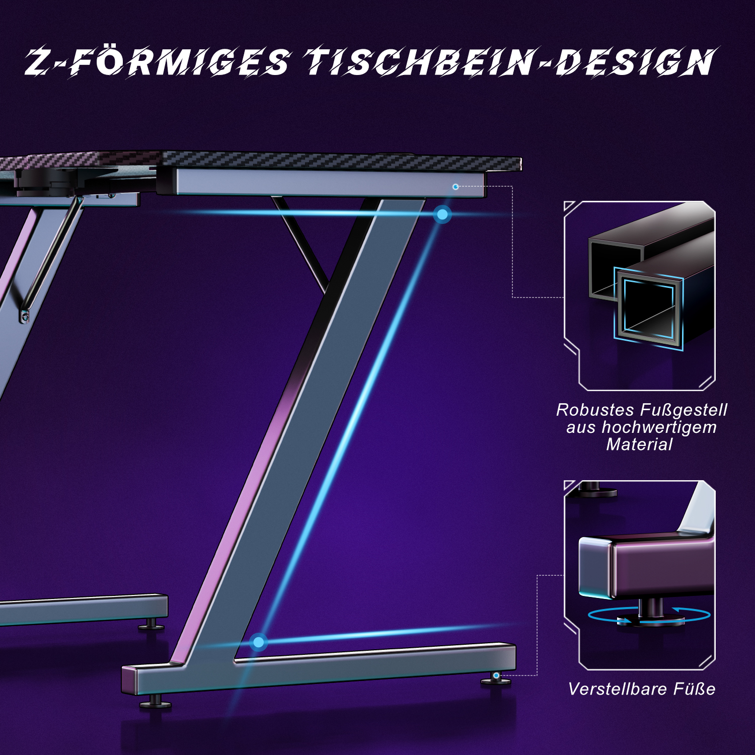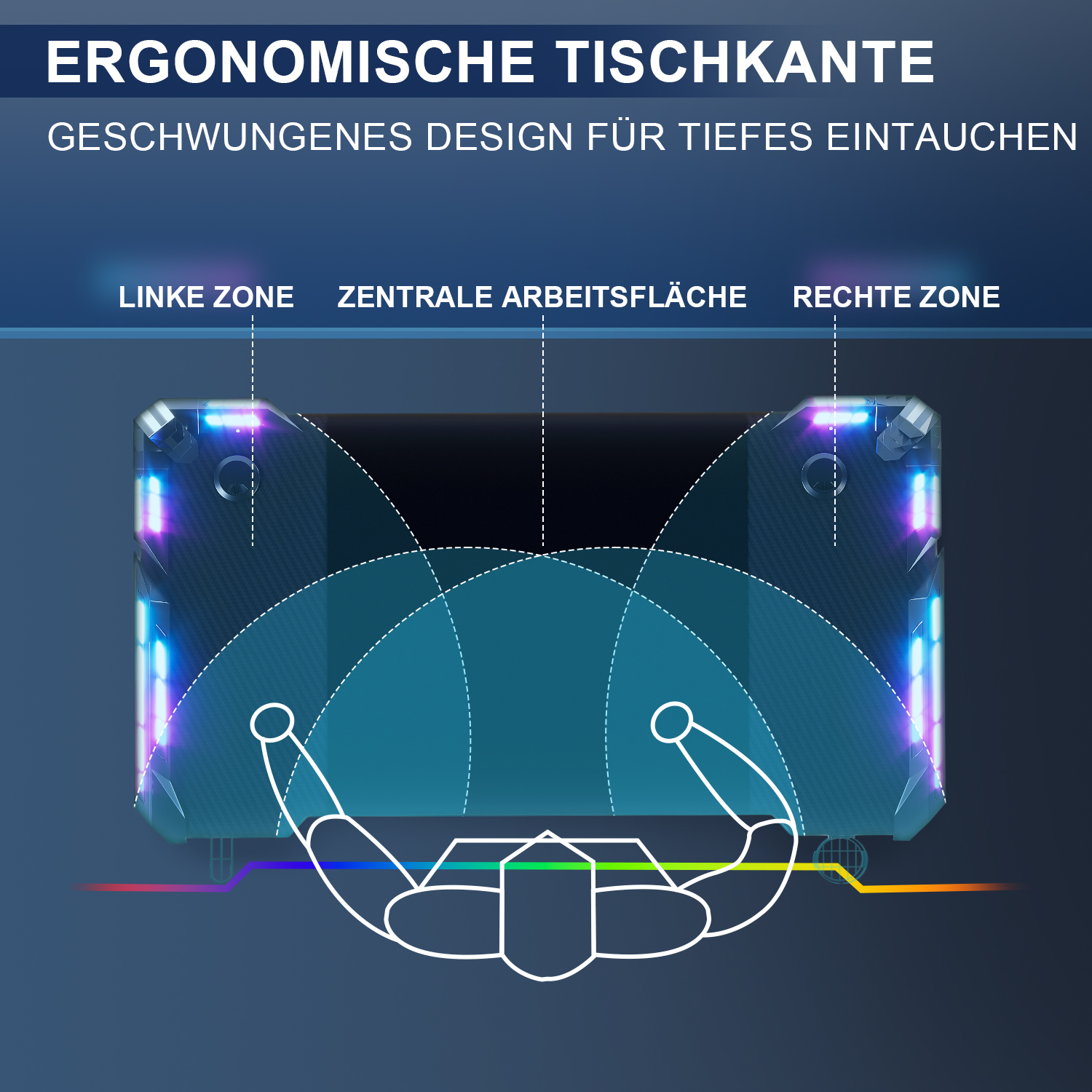【Coole RGB LED】Illusions-Gaming-Atmosphärenlichtsystem mit speziellen Effekthalo, das Licht ist weich und nicht blendend, bietet ein immersives Spielerlebnis. Mit der Fernbedienung können Sie die Farbe, die Geschwindigkeit und die Helligkeit der Lichter anpassen, Ihre bevorzugten Lichteffekte einstellen und mit einem Klick die Gaming-Orientierung aktivieren, um Ihre Gamer-Identität zu zeigen.【Innovatives Design】Basierend auf den physikalischen Prinzipien des industriellen Strukturdesigns besteht der Schreibtisch aus kaltgewalztem Stahl in Karbonschwarz, der hart und insgesamt sehr stabil ist. Die Belastung wird gleichmäßig zwischen den Beinen verteilt, was die Greifkraft des Tisches erhöht und eine überragende Tragfähigkeit ermöglicht. Die mechanische Belastbarkeit überschreitet 150KG. Mit verstellbaren Füßen bleibt der Tisch auch auf unebenen Flächen stabil, was das Spielerlebnis und die Präzision der Bedienung deutlich verbessert.