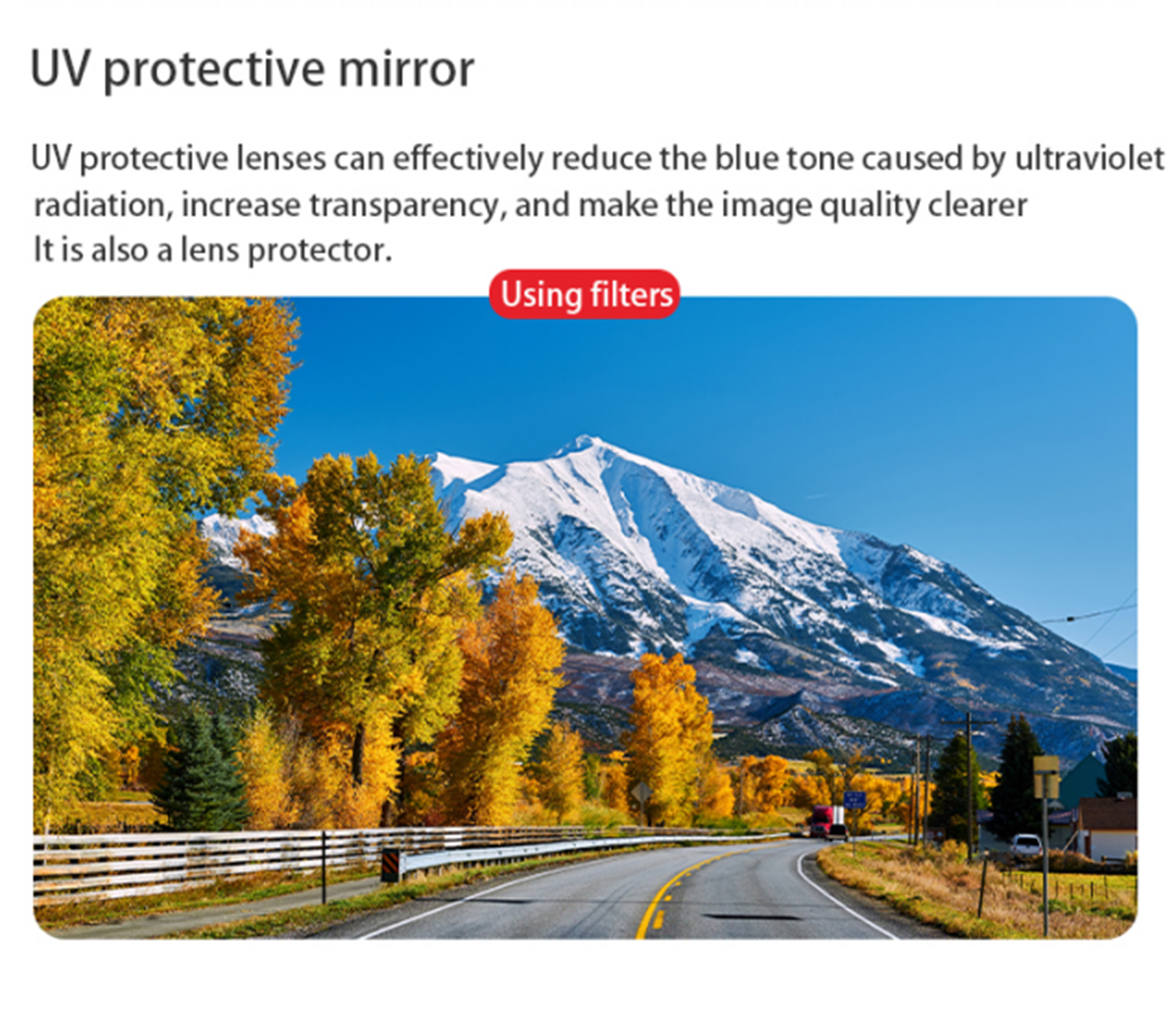 1. UV filter: suitable for shooting in environments such as the seaside, mountainous areas, snowfields, and open areas, it can reduce the blue tone caused by ultraviolet radiation. For cameras, it can also eliminate the interference of ultraviolet light on the CCD, which helps improve clarity and color restoration effects.