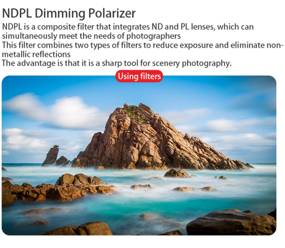 3. ND filter: By using this filter, you can gain more freedom to control the aperture and shutter, providing more exposure methods and creative space for photography, and effectively preventing overexposure. The number after ND represents the ability of ND mirror to block light