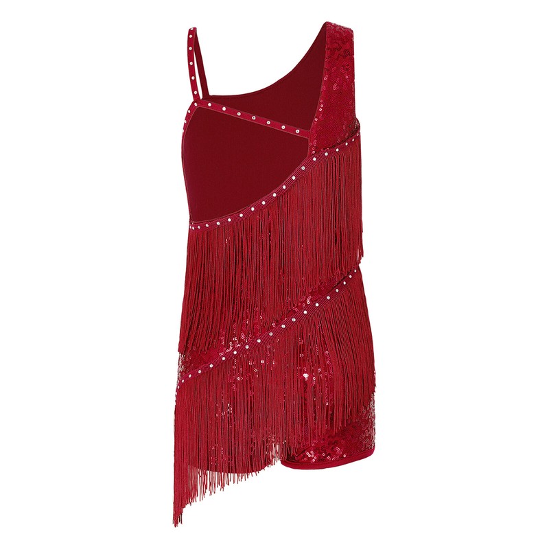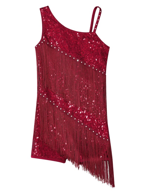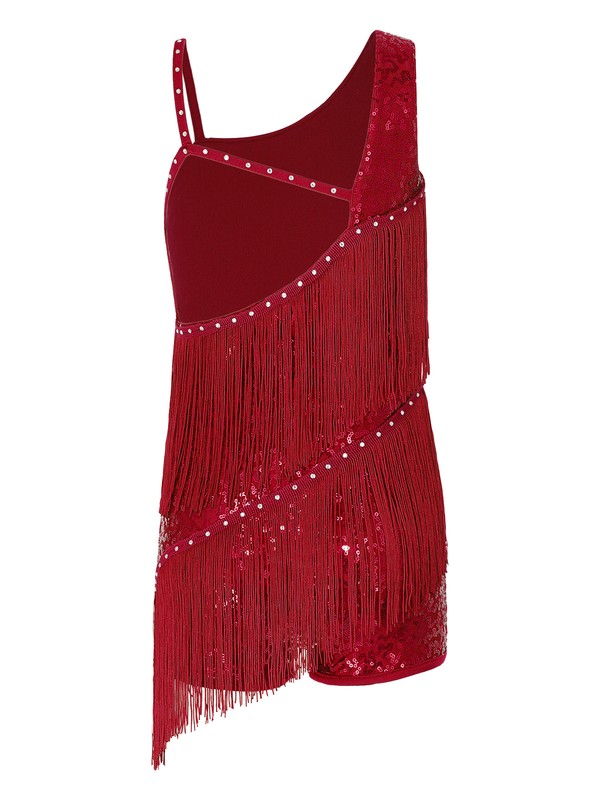 Hollow back, shiny sequins and rhinestone decorated, tassel straps outlook, boxer bottom hem, very fashionable.