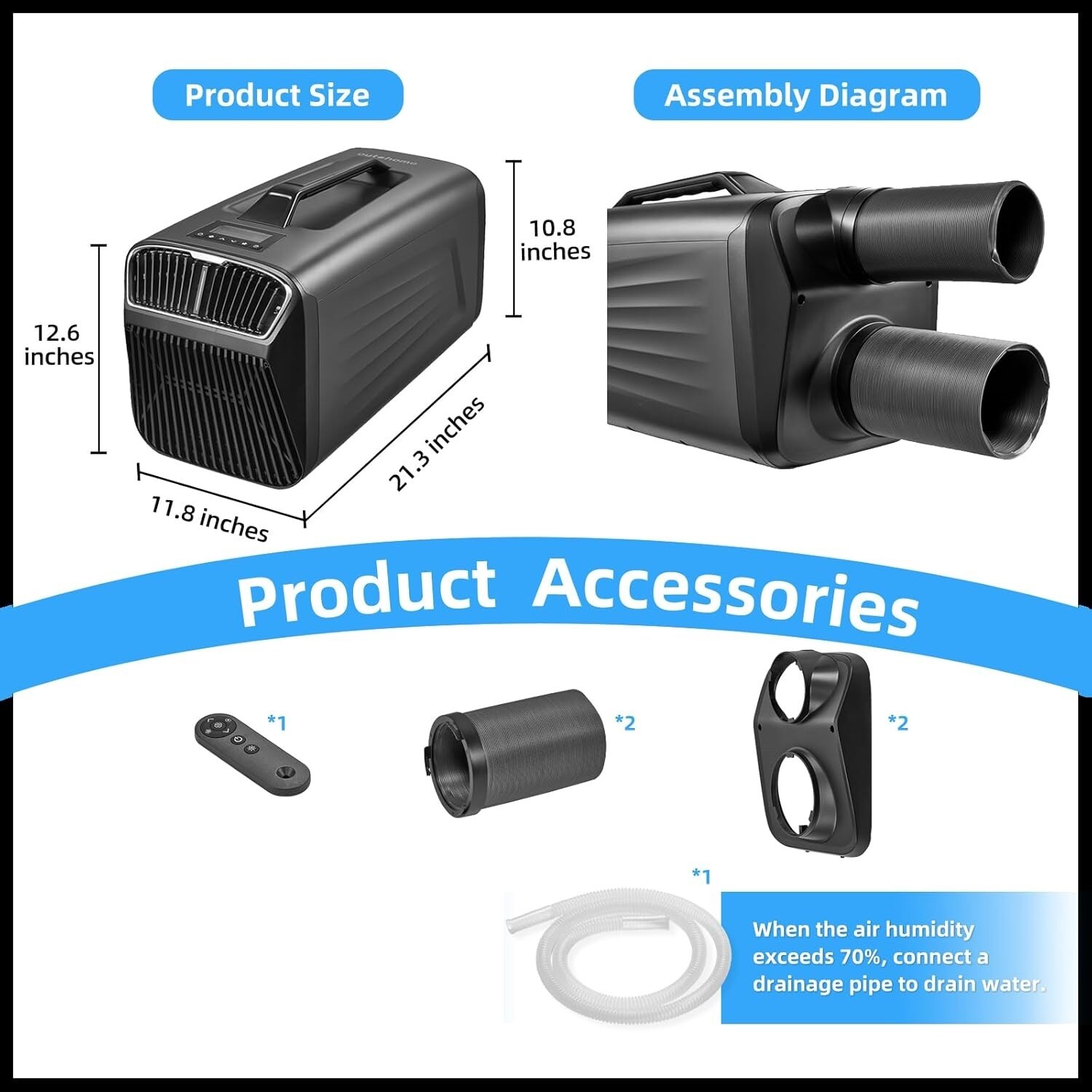 Drainage Free and Dehumidification:No drainage is needed in cooling mode when humidity is below 70%.However,we still equipped the customers with a drainage pipe.When the indoor humidity is higher than 70%,you may need to use it. Fortunately,this outdoor air conditioner also has a dehumidification function.You can regard it as a highly efficient dehumidifier.During the humid season,it will perform much better than those semiconductor dehumidifier
