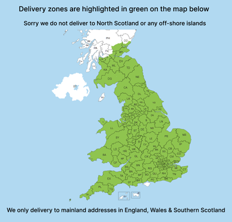 Delivery Zones - We offer free delivery to any address in mainland England, Wales and Southern Scotland. Sorry but we do not deliver to Ireland or any off-shore islands or the following North Scotland postcode areas: AB – BT – DD(8>11) – FK(17>21) – G(82>84) – GY – HS – IM – IV – JE – KA27 – PA(20>80) – PH6 – PH(8>12) – PH(15>50) – PO(30>41) - ZE