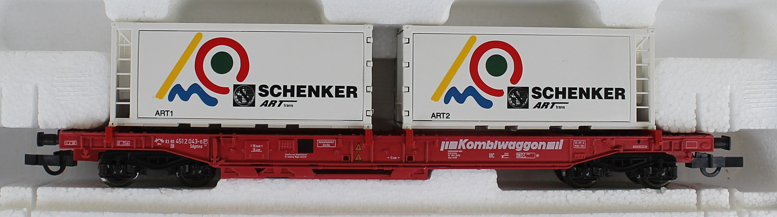 Vorbild: Vierachsiger Einheitstaschenwagen Sdgmms 743 der Deutschen Bahn AG (DB AG) in rot mit 2 Kühlcontainer der Firma "SCHENKER Art Trans" beladen. Betriebsnummer 83 80 451 2 043-6.