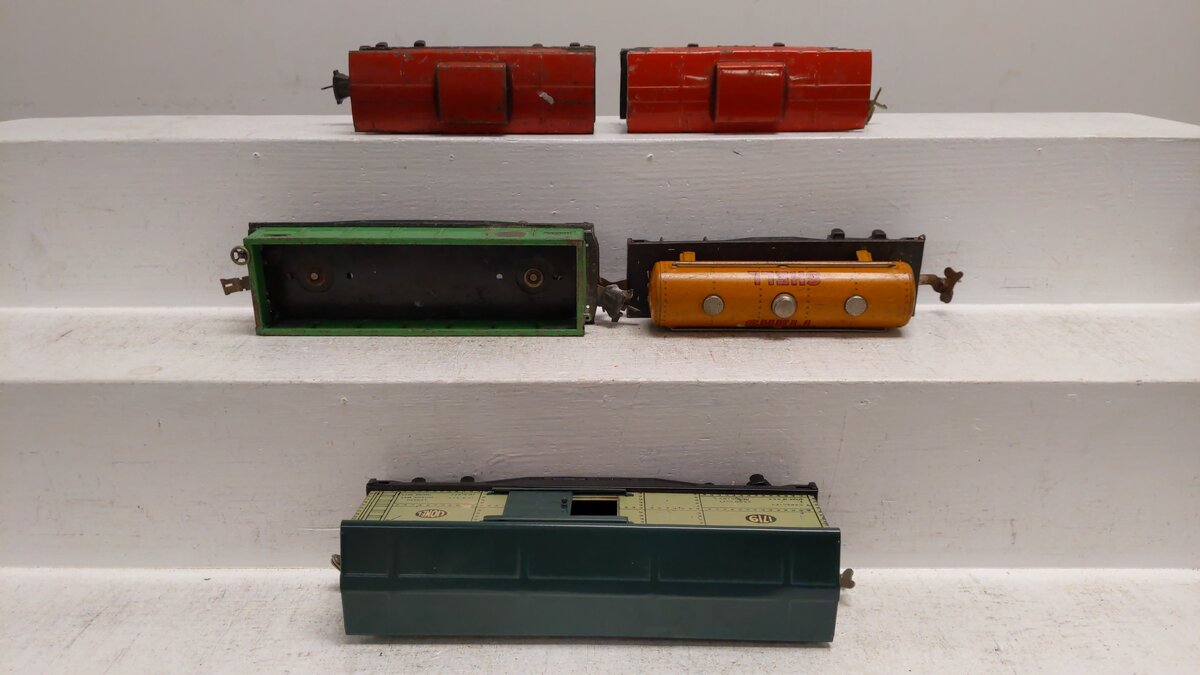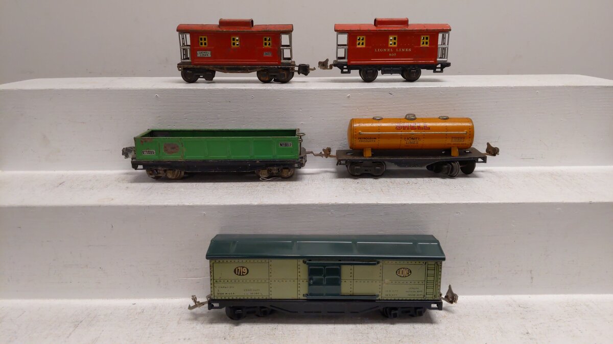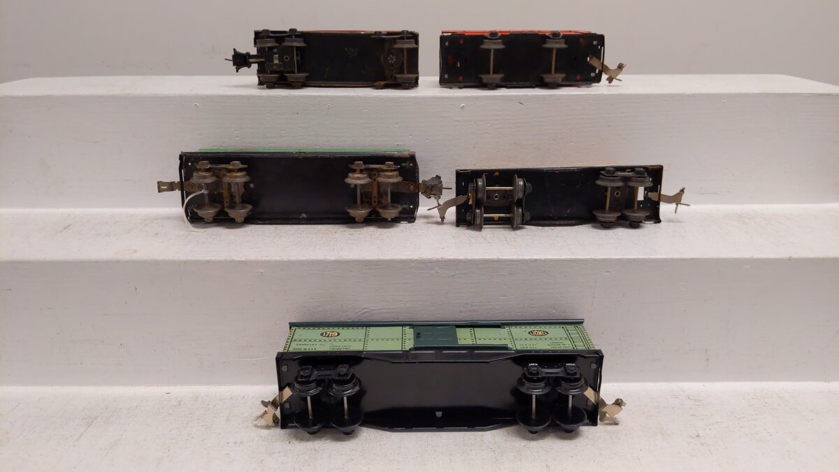 Here are 5 Lionel O Gauge Assorted Vintage Prewar Freight Cars- 1719, 812, 1680, 2657 and 807. Each car features die-cast metal or plastic trucks, metal wheels and axles.