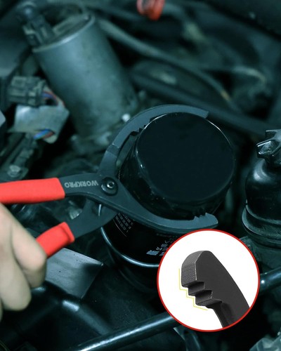 👍 12" Adjustable Oil Filter Pliers with Slip Joint Design: Features strong jaws and serrated teeth for a firm grip on oil filters from 2-3/8" to 4" (60-102mm) in diameter. The ergonomic red handle offers a soft, non-slip grip and extended reach- ideal for tight spaces and added torque leverage
