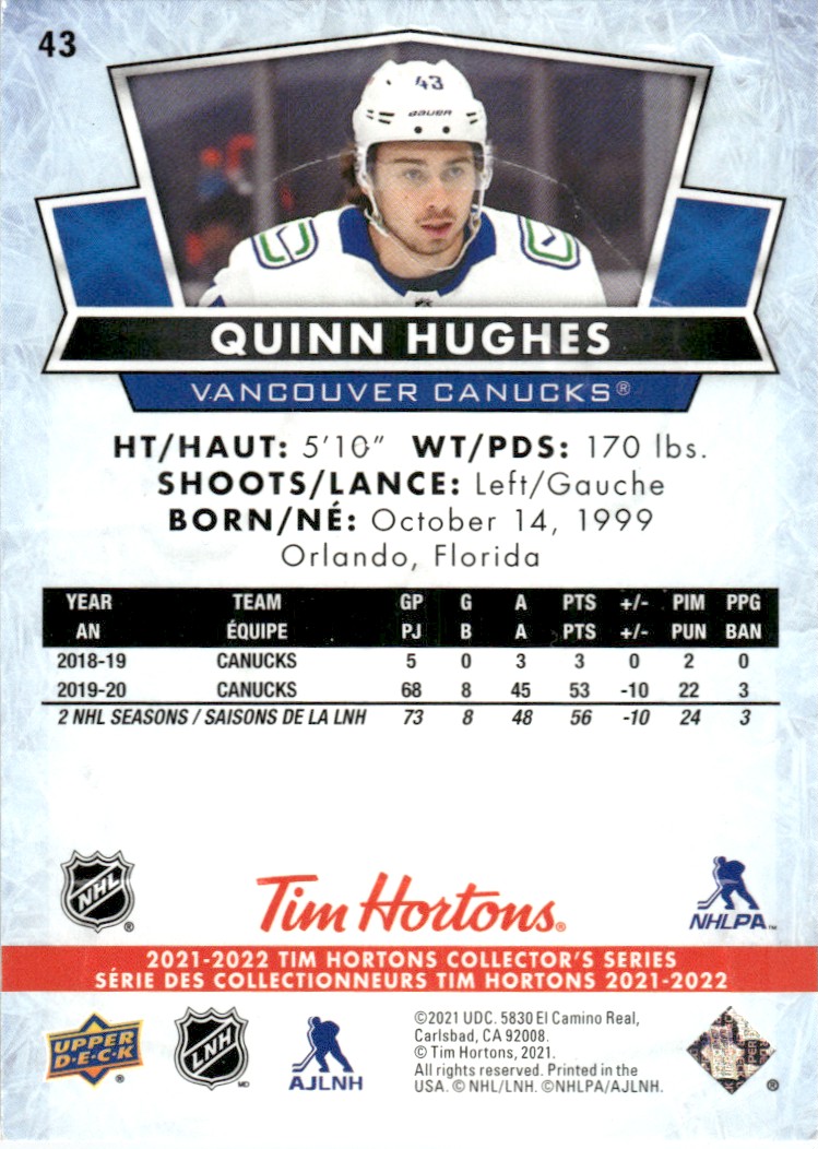 | 2021-22 Upper Deck MVP Blue UD Hockey Quinn Hughes Vancouver Canucks #43 |