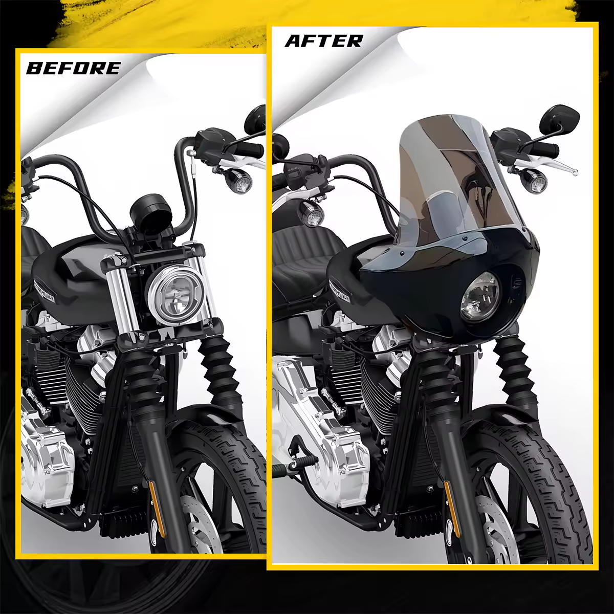 Included with all fairings is a universal mounting kit that provides you with everything you need to install on your motorcycle. Our unique universal designs can be used on most applications with a 5.75” headlight. Measures 17" from apex of headlight opening, to top of windshield.