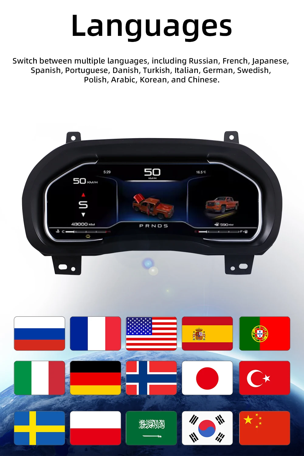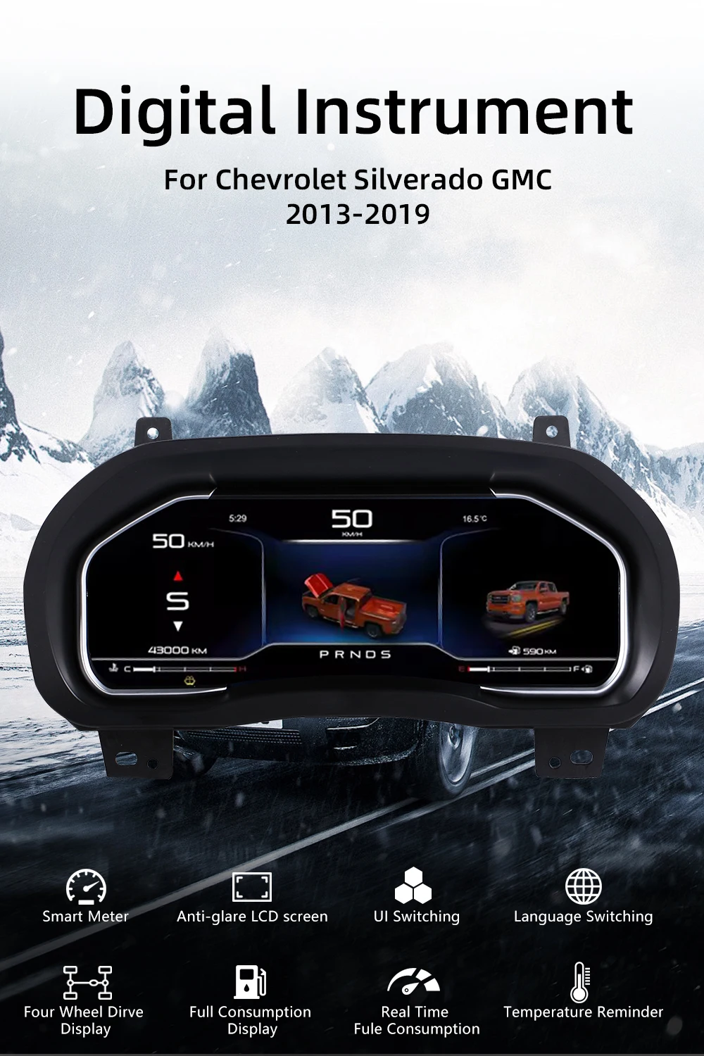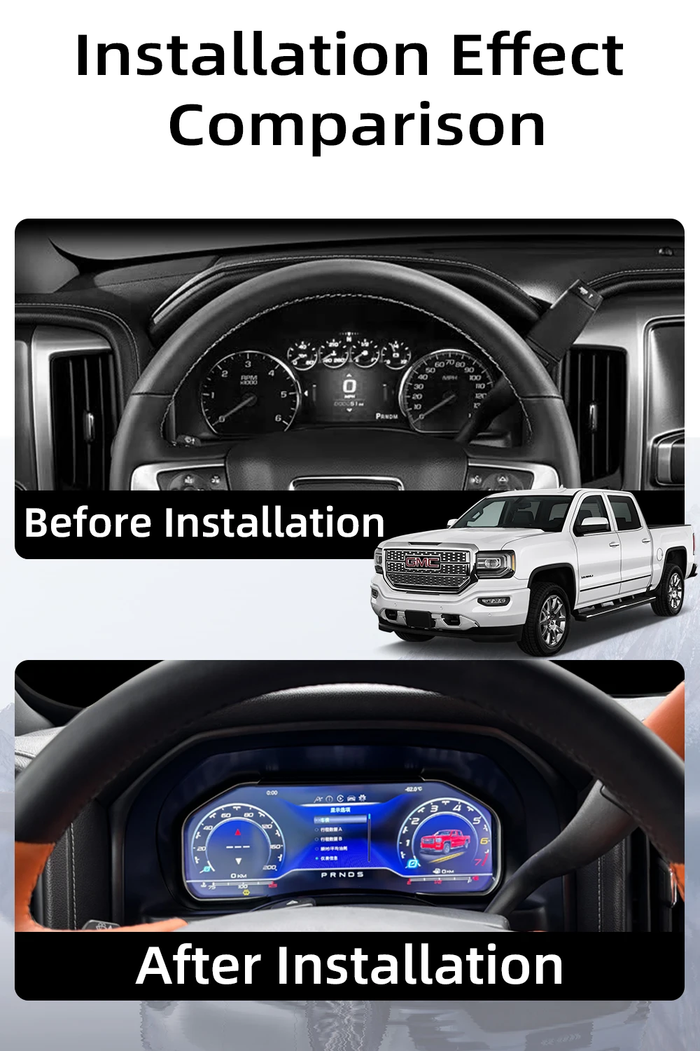 For Chevrolet Suburban Tahoe Silverado GMC SIERRA models,Restores most original instrument cluster functions while adding multiple practical features, including real-time vehicle information display: Tire pressure monitoring, fuel gauge, odometer, speedometer, RPM, gear position, oil temperature/life/pressure, coolant temperature, fuel consumption. Supports multiple interface styles and language settings, featuring speed alerts, door open warnings, seatbelt reminders, and more.