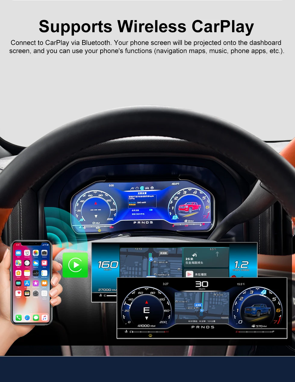 Supports IOS Carplay. connects to the dashboard Bluetooth and your phone is projected onto the dashboard. Some apps on your phone are also projected onto the dashboard, such as maps, music, social apps, etc.