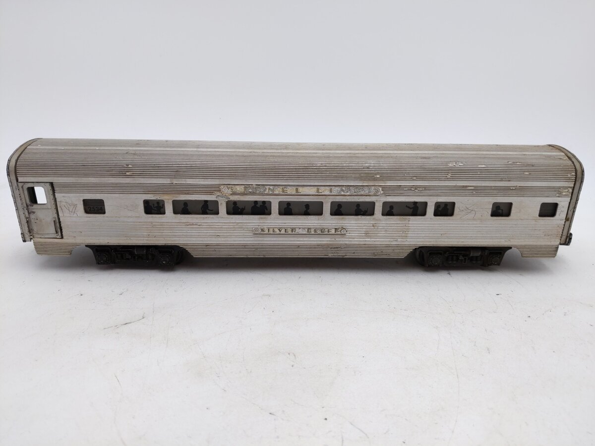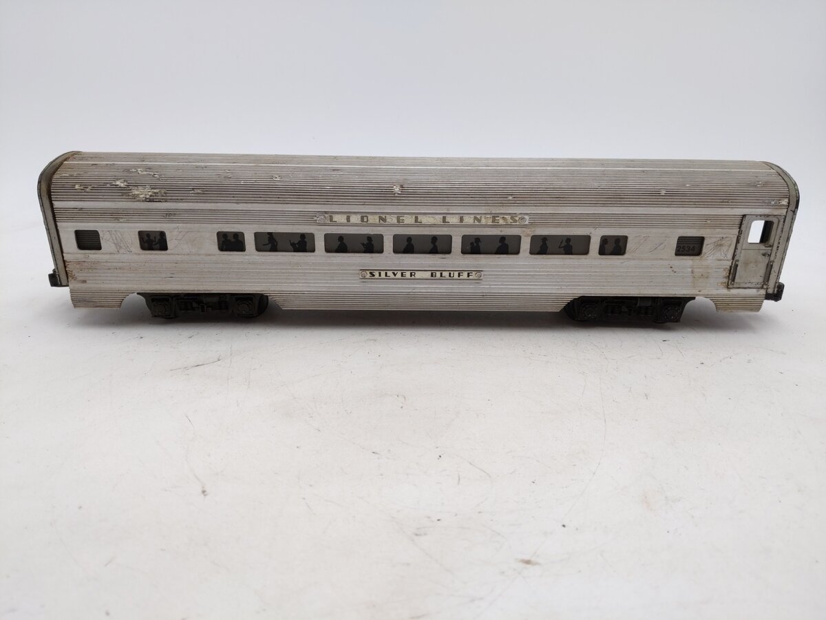 Here is a Lionel 2534 Vintage O Silver Bluff Aluminum Pullman Car. Features: Aluminum construction, die-cast trucks, metal wheels, operating knuckle couplers, and interior illumination.
