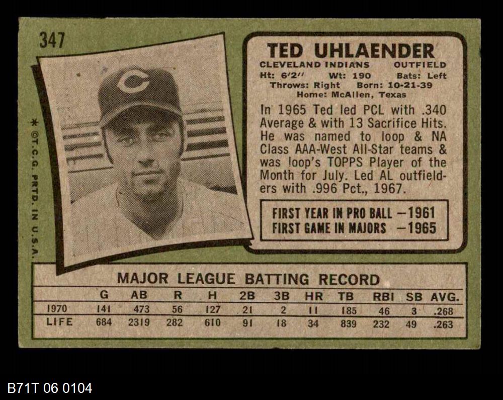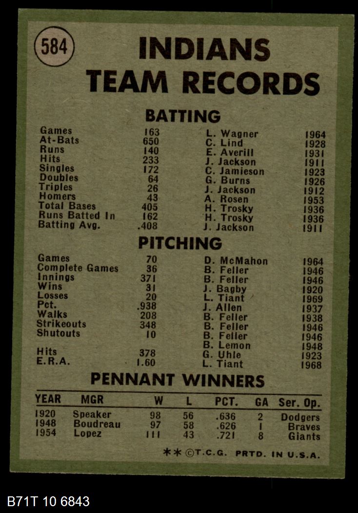This near team set contains 20 cards out of the possible 28 cards. This is not a complete set. This set does not include the following cards: #150 Sam McDowell, #275 Vada Pinson, #539 Larry Brown, #552 Buddy Bradford, #597 Ken Suarez, #612 Indians Rookies - Steve Mingori / Lou Camilli / Ted Ford, #689 Frank Baker, #727 Ray Lamb