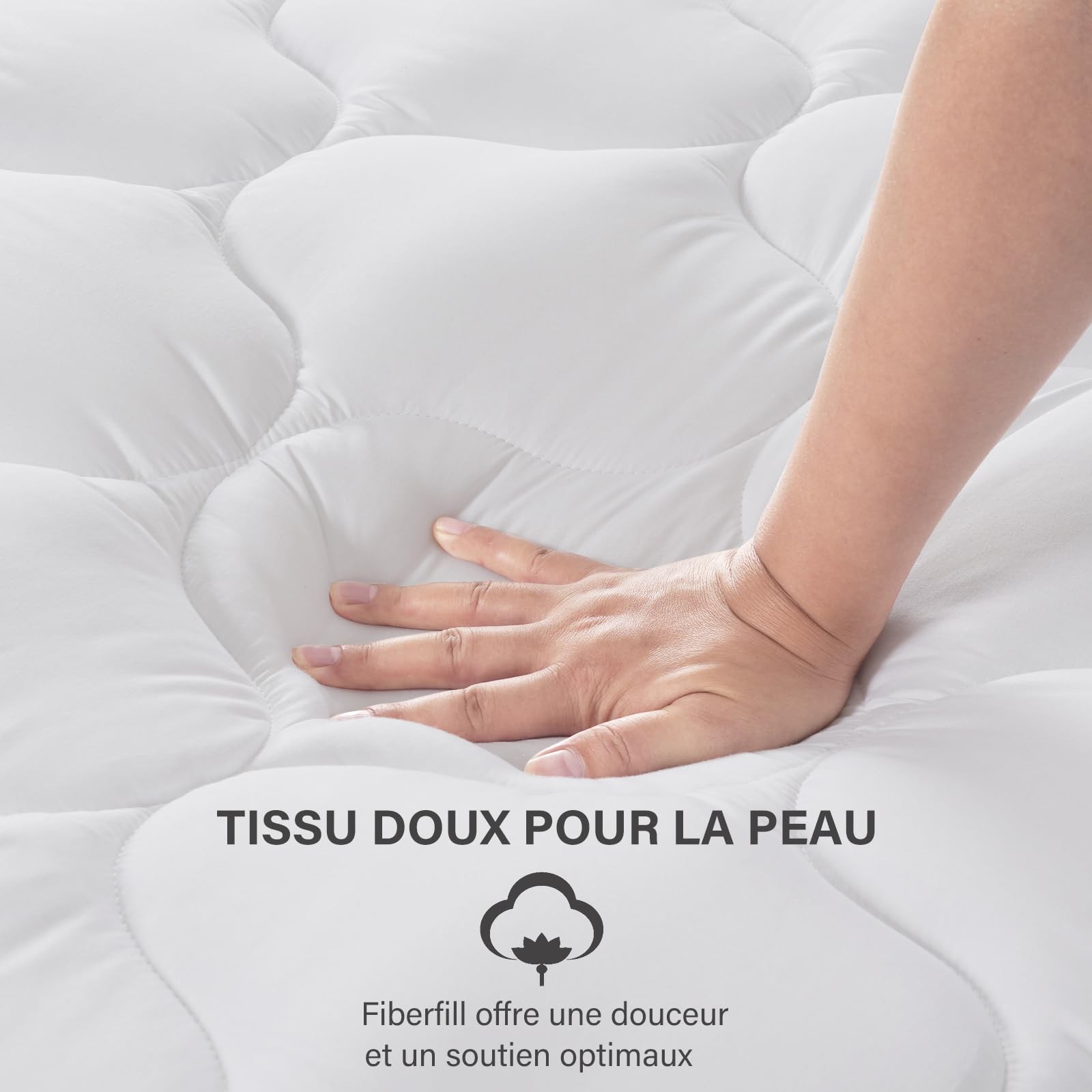 Kuehle und atmungsaktive Matratzentopper : Die Schlafflaeche aus ultrafeinen Fasern mit einem Gewicht von 105 g/m² sorgt fuer ein kuehles Gefuehl und eine gute Belueftung, waehrend die Fuellung aus ultrafeinen Fasern die Luftzirkulation verbessert. Sie bietet Ihnen eine bequeme und atmungsaktive Schlafumgebung, damit Sie sich wohlfuehlen, ohne zu viel Hitze oder Schweiss zu produzieren.