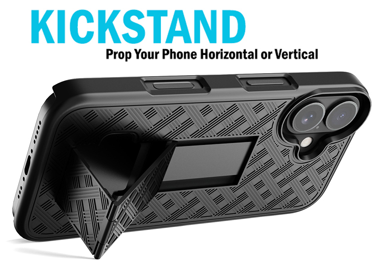 CASE KICKSTAND: Back of the case features built-in kickstand. Unsnap the hinge then slide downward until the kickstand snaps into place. Now you can prop your phone in vertical/horizontal positions at your desk - This is ideal for watching movies and videos - also a handy prop for those facetime video calls.
