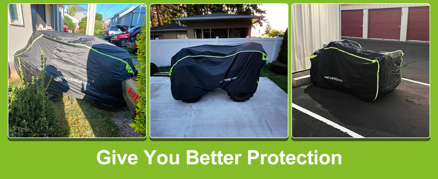 NEVERLAND ATV cover use the high quality 190T polyester fabric, which is more anti-ultraviolet, weatherproof, tear-resistant and wear-resistant than 170T, 180T material. Protect your ATV from dust, heat, tree sap, harmful UV rays and bad weather with top to bottom cover